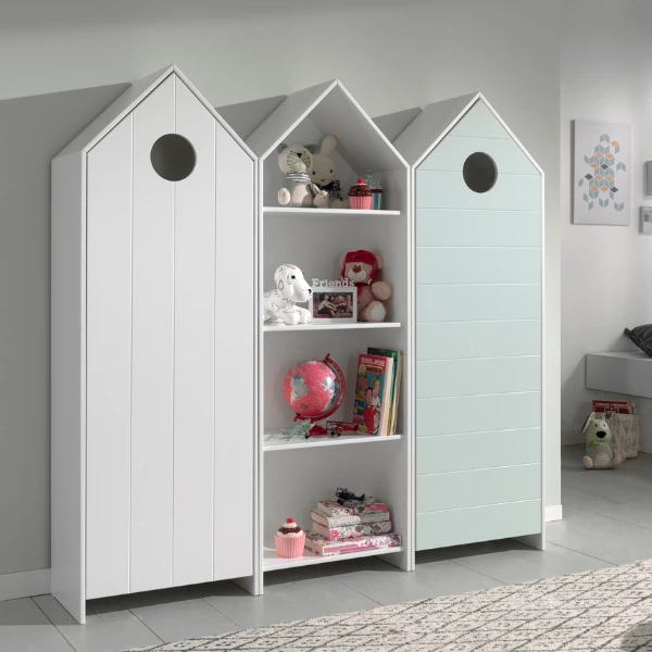 Réalisée en thème de plage, ces jolies armoires de la série Casami plaira assurément à votre enfant ! Lors du montage, vous pouvez choisir vous-même d’installer 3 tablettes et une tringle (poids supportable 5 kg) ou 4 tablettes. Par la combinaison de l’armoire avec la bibliothèque Casami vous créez énormément d’espace de rangement pour les vêtements et d’autres objets de votre petit trésor. Les armoires et la bibliothèque sont fabriquées en MDF de haute qualité et sont laquées en blanc, les portes vert menthe et blanches des armoires sont décorées avec des lignes verticales. Ouvrez les armoires à l’aide de la fenêtre dans la porte (⌀15 cm) ou fixez la poignée en métal fournie.