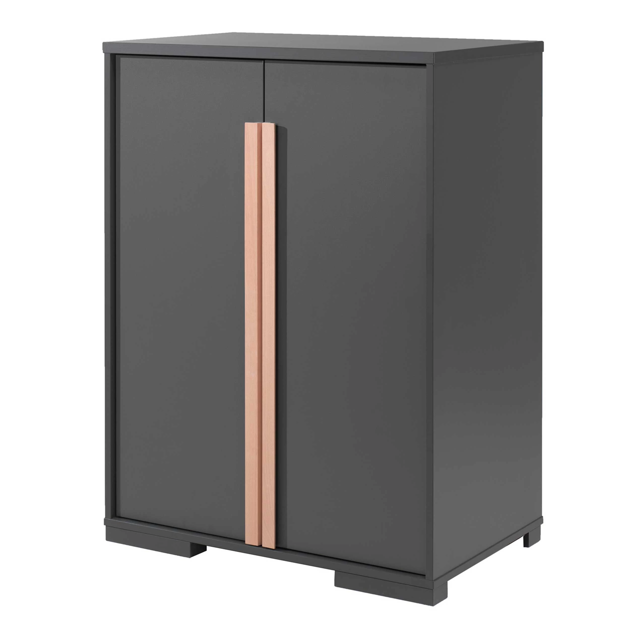 Ce meuble de rangement élégant, de couleur anthracite, de la série London de Vipack est fabriqué en panneaux de particules de haute qualité et est très robuste. Derrière les deux portes tournantes, vous disposez de deux étagères réglables pour ranger des vêtements, des jouets ou d’autres objets. Les longues poignées verticales en hêtre massif facilitent l’ouverture et la fermeture de l’armoire et apportent une touche de chaleur.