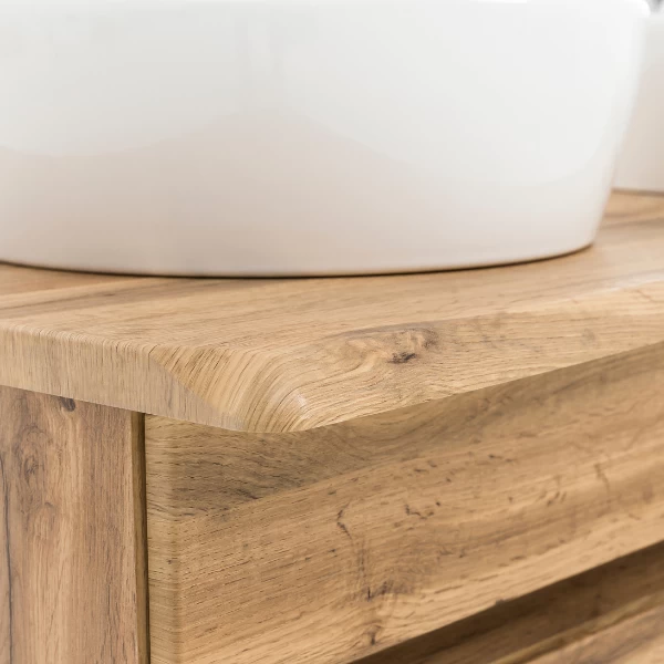 La collection Vikas combine un design minimaliste avec un look naturel. Ce meuble-lavabo est fabriqué en panneaux d’aggloméré et de MDF, avec une finition mélaminée en décor chêne. Le design épuré et l’aspect bois créent un look pur, tandis que la forme organique du plateau renforce le caractère naturel. Les deux lavabos en céramique est inclus. Les tiroirs de rangement peut être utilisé pour stocker toutes sortes d’ustensiles de salle de bains. Cette collection est également disponible en finition anthracite. Découvrez la gamme complète sur notre site web.