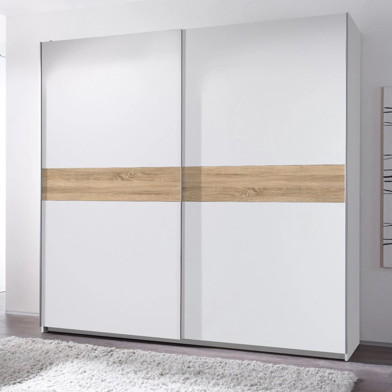 Cette armoire moderne à portes coulissantes Salamanca est réalisée en aggloméré blanc et complétée par une bande en décor chêne sonoma. L’armoire à deux portes est divisée en deux éléments équilibrés, munis chacun d’une tringle à vêtements et d’une étagère intérieure. Avec ses 215 cm de largeur et ses 2 m de hauteur, c’est la solution de rangement idéale pour tous vos vêtements préférés !