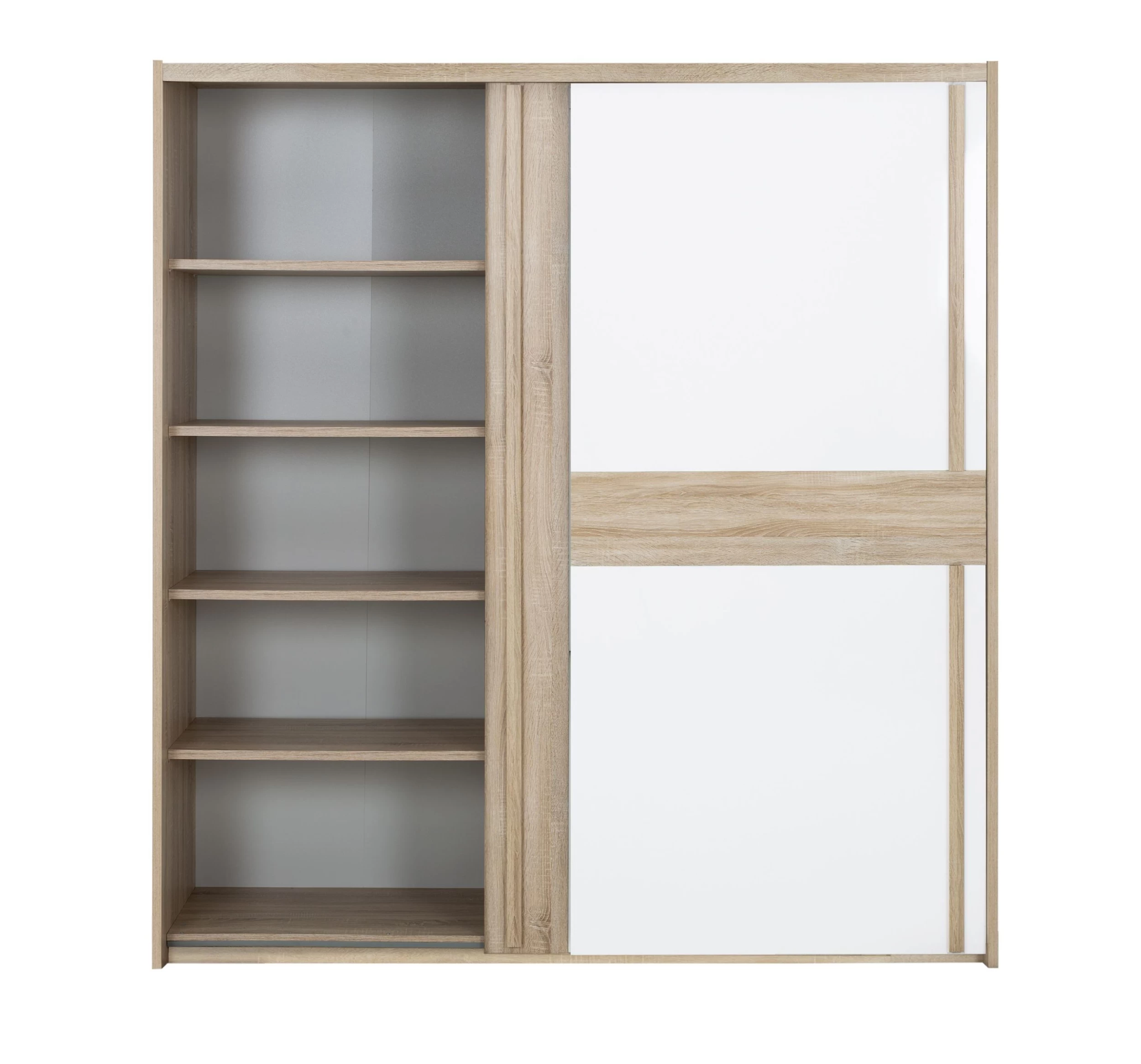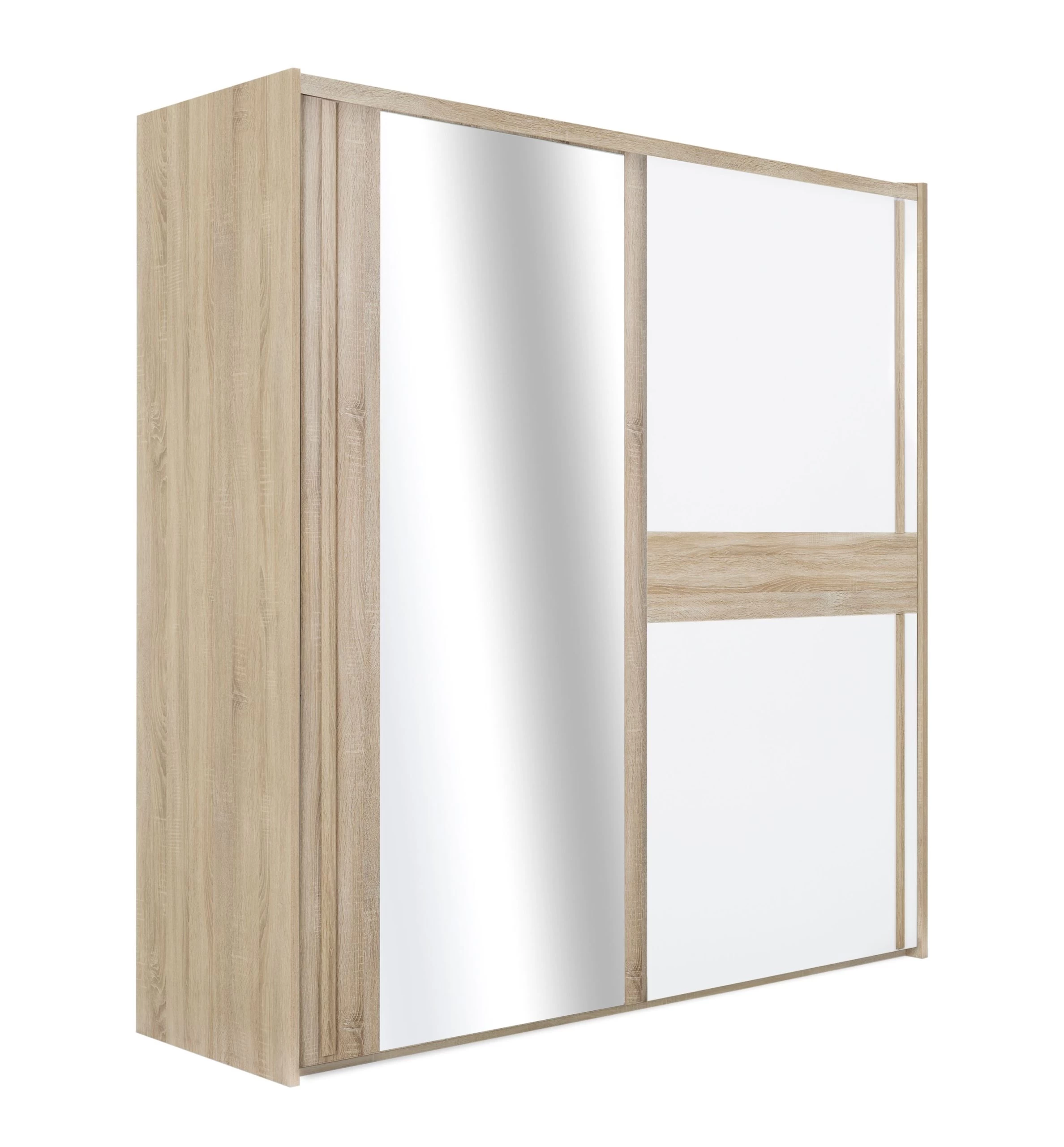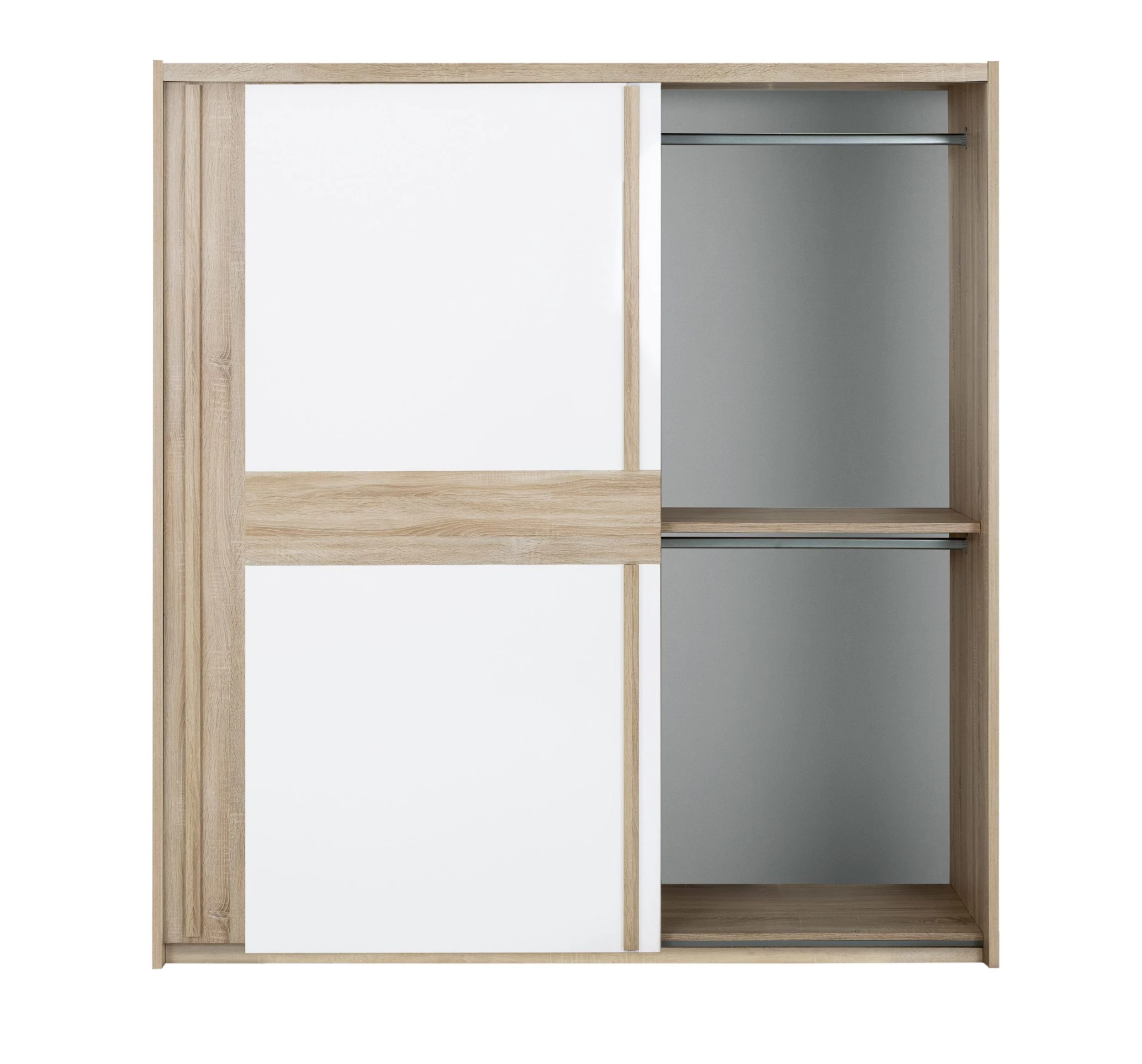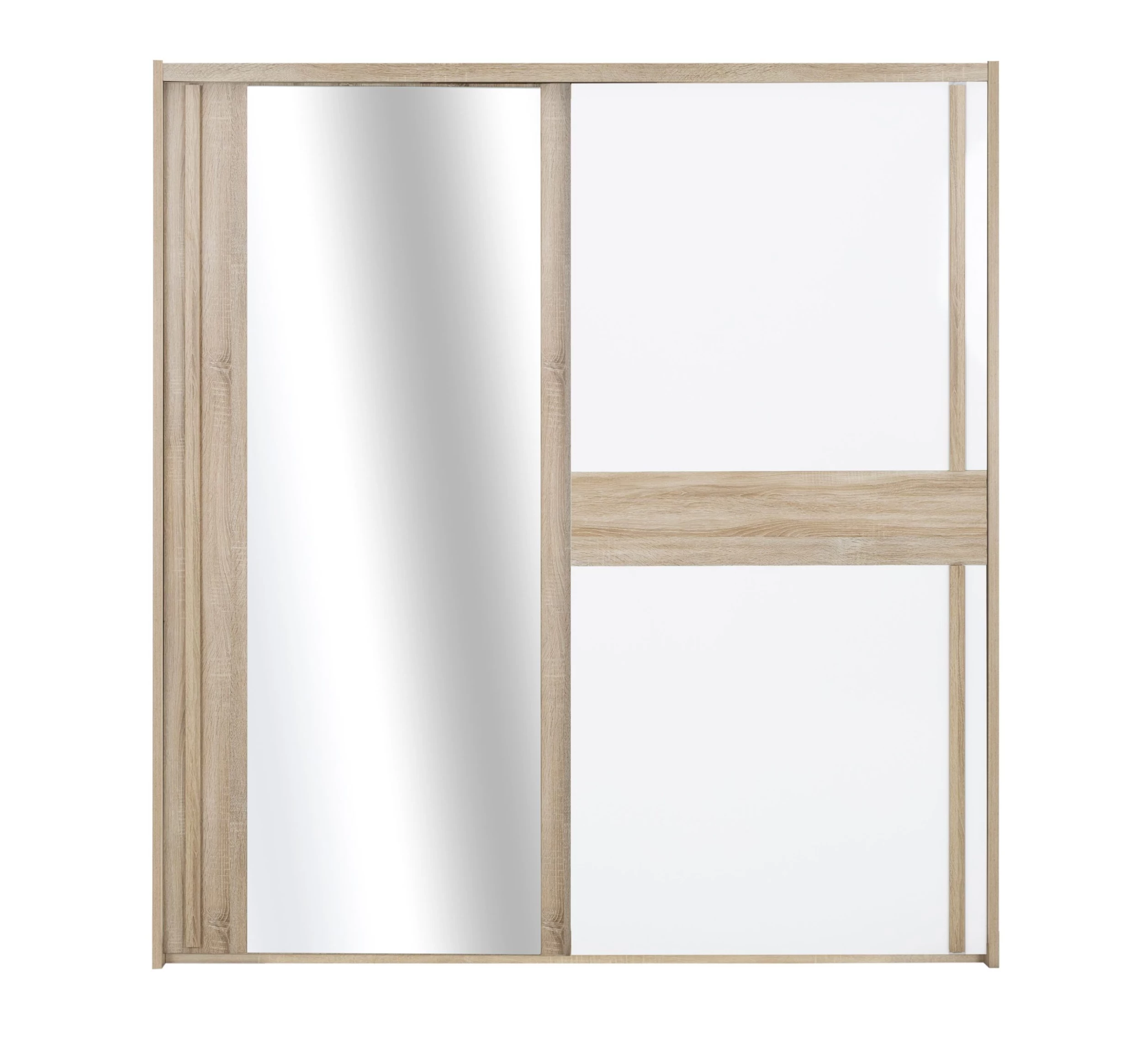 Cette armoire Alto est dotée de deux portes coulissantes, dont l’une est une porte miroir. Les poignées sont en MDF. Derrière les portes, vous trouverez deux tringles à vêtements et cinq étagères. L’armoire mesure 221 cm de long, 61 cm de large et 214 cm de haut.