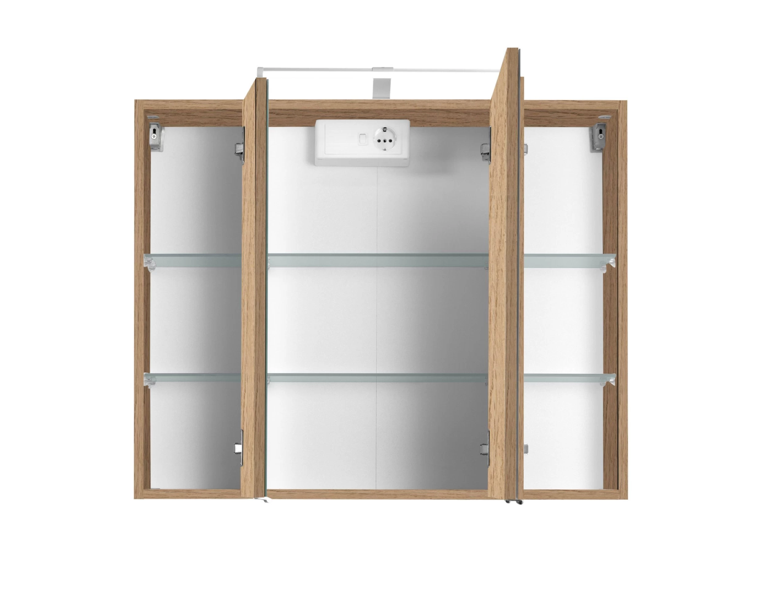 Apportez une touche chaleureuse à votre salle de bains avec les meubles de la collection Bobbi, qui comprend également cette armoire de toilette de 90 cm de large. L’armoire est équipée de 3 portes, de 6 étagères en verre, d’éclairage LED (4,5 W), d’un interrupteur et d’une prise de courant. Elle est réalisée en panneaux de particules mélaminés avec un décor en chêne.