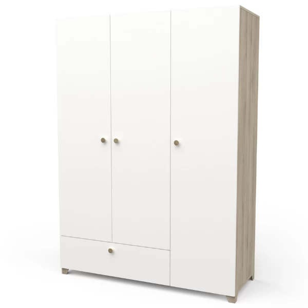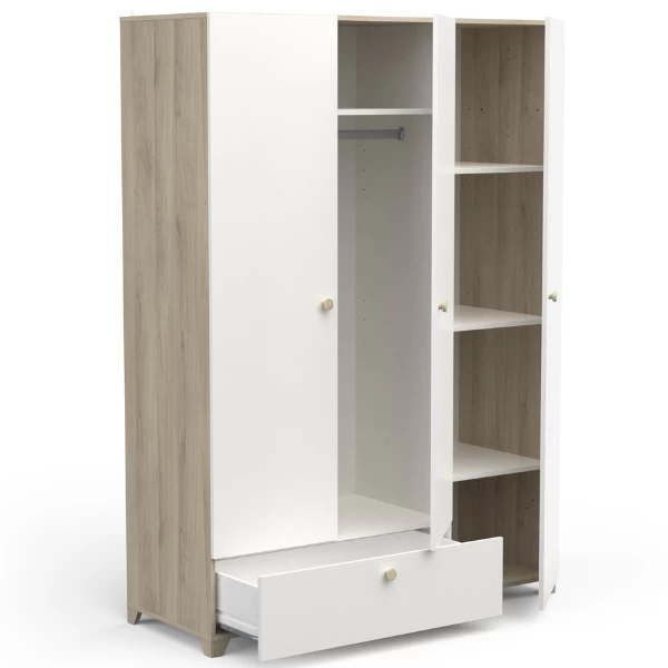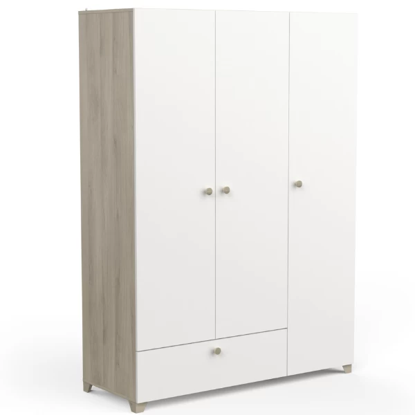 Les accents de nature clairs en décor chêne Kronberg et le blanc mat font que cette armoire s’intégrera parfaitement dans un style d’intérieur scandinave. Derrière les 3 portes tournantes il y a 4 étagères et une tringle pour votre garde-robe personnelle et dans le tiroir en bas il y a de l’espace pour votre literie. Combinez avec le lit simple Liva, la table de chevet Liva et le chiffonnier Liva et vous avez une chambre d’enfant scandinave pleine d’ambiance. Vis et chevilles pour montage mural non-inclus.