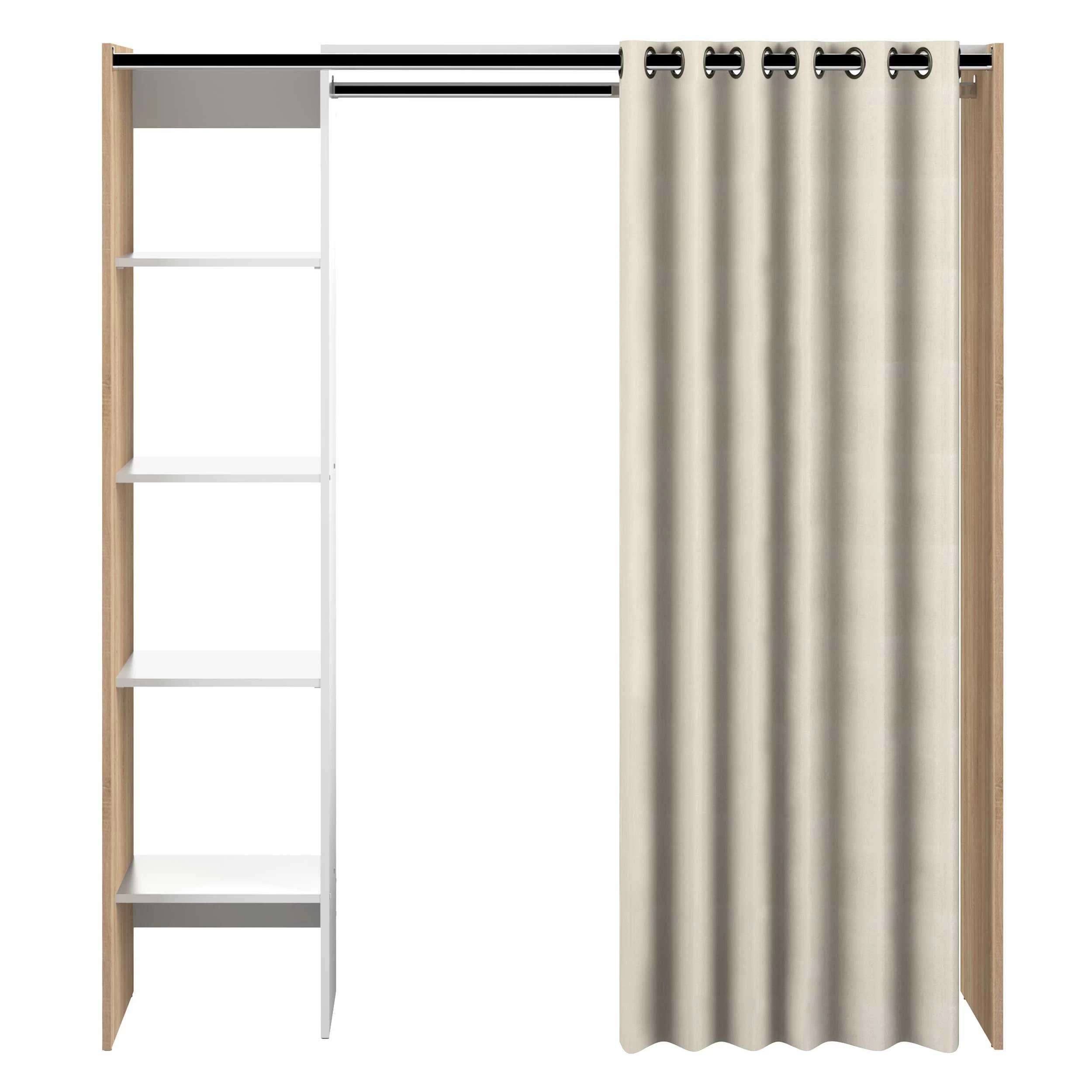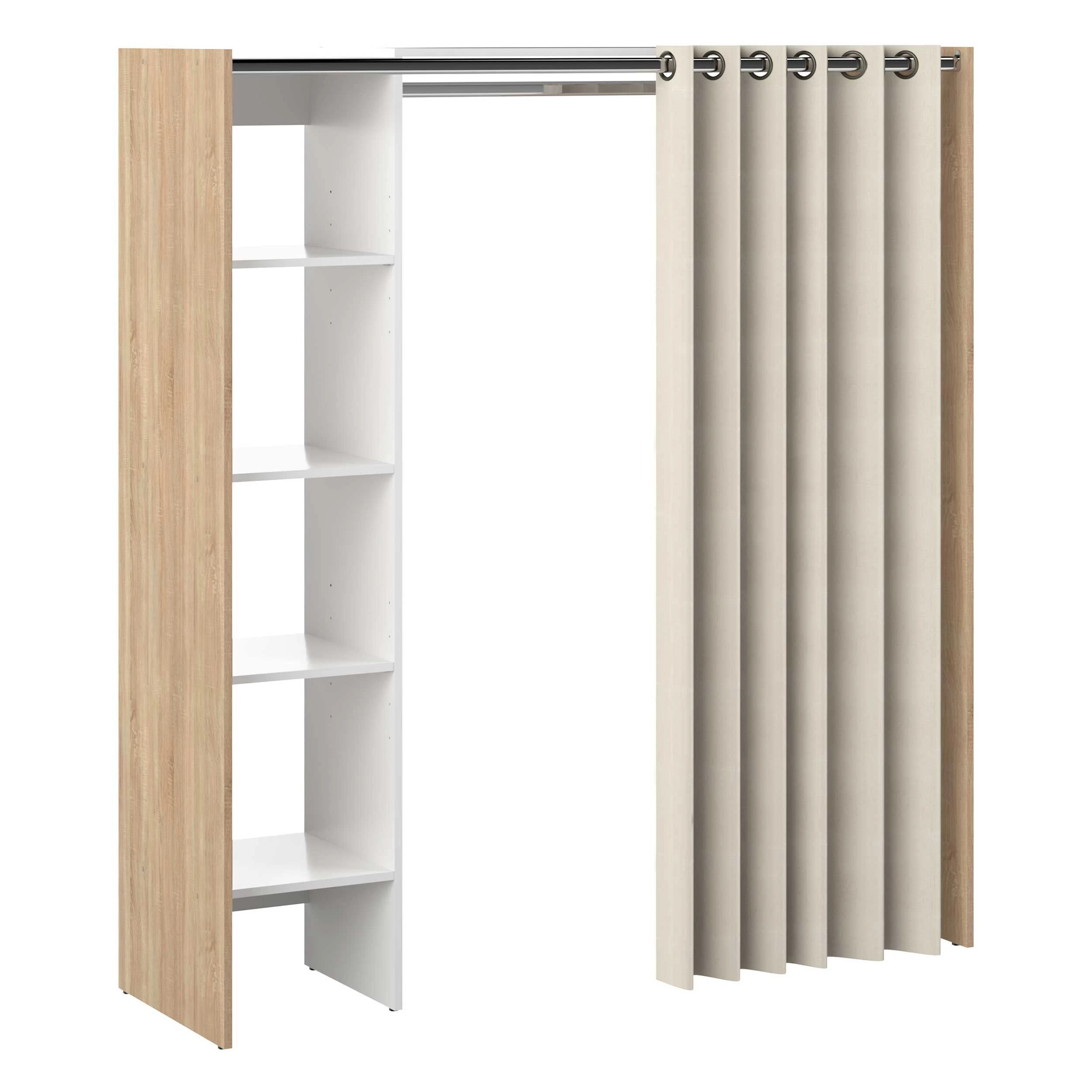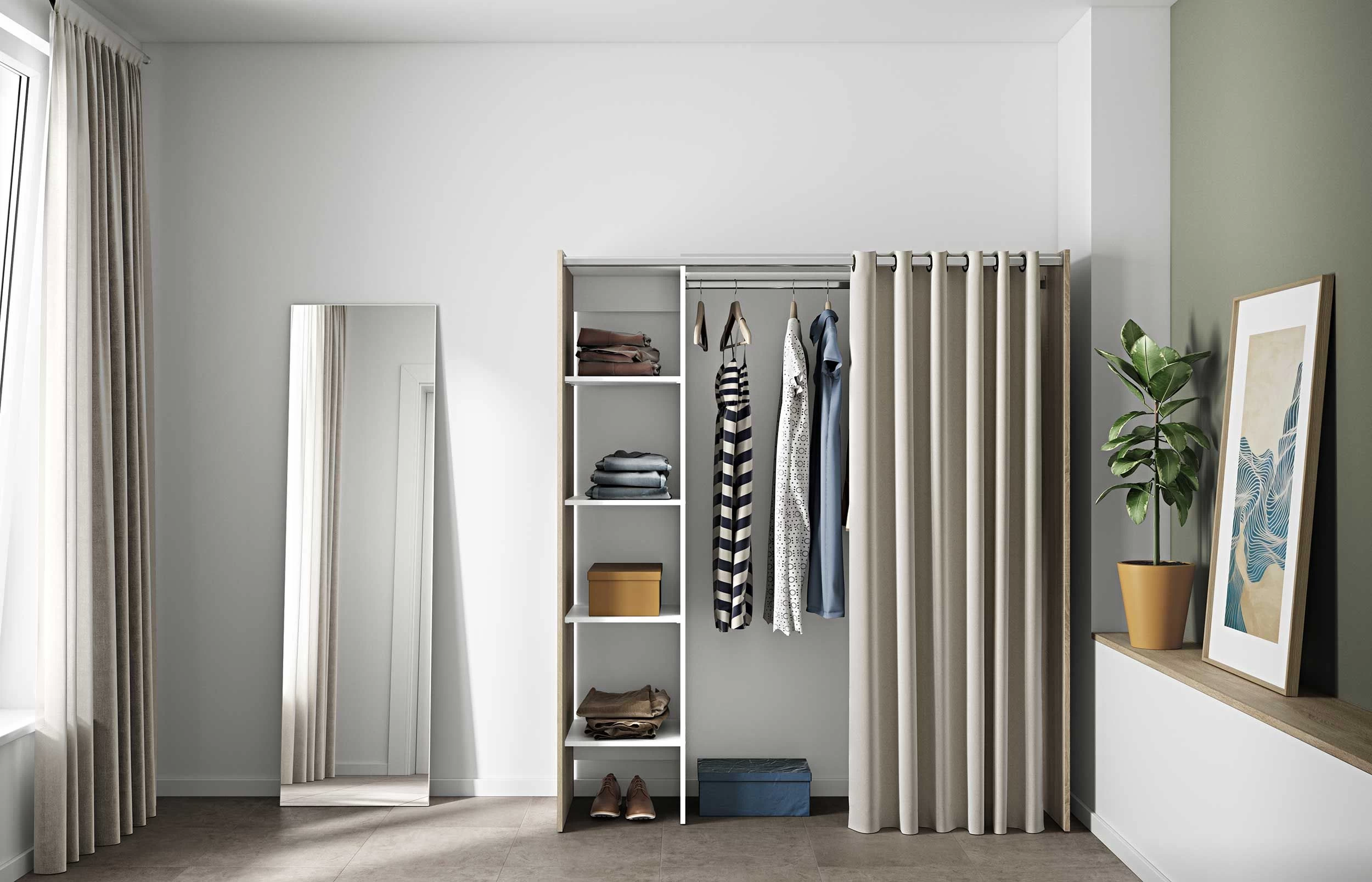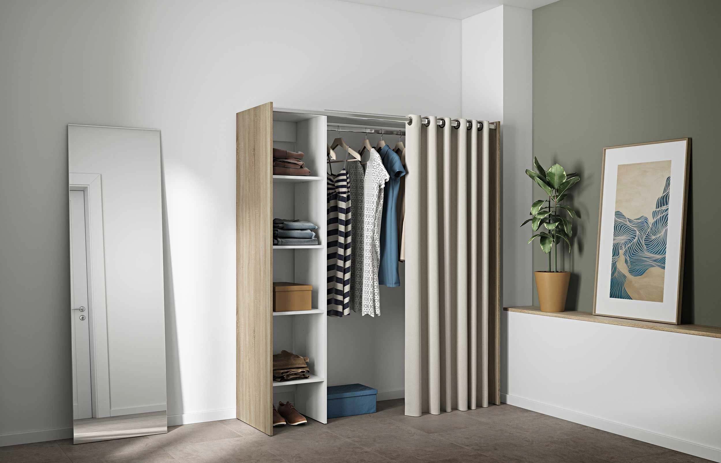 Vous avez du mal à choisir entre une armoire ou un dressing ? Optez pour le meuble Spike ! Il se distingue de toutes les autres armoires par le rideau écru qui remplace les portes. L’armoire compte 4 tablettes et une tringle. Sa caractéristique la plus particulière ? Vous pouvez choisir vous-même sa longueur pendant le montage : de 123 cm à 160 cm. Ainsi, l’armoire s’adapte aux dimensions de votre chambre et/ou au nombre de vêtements que vous possédez !