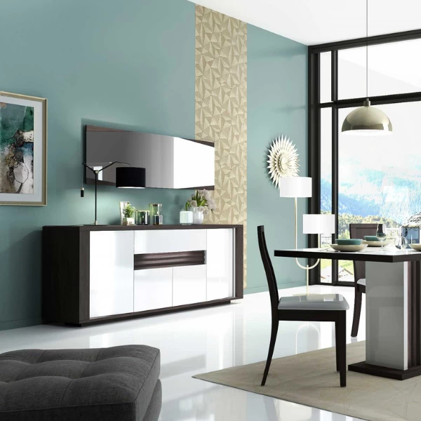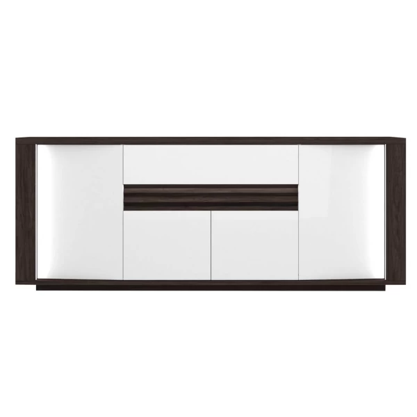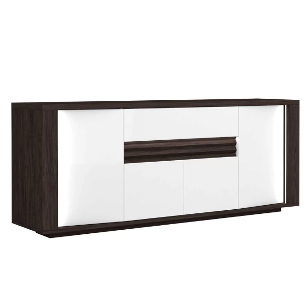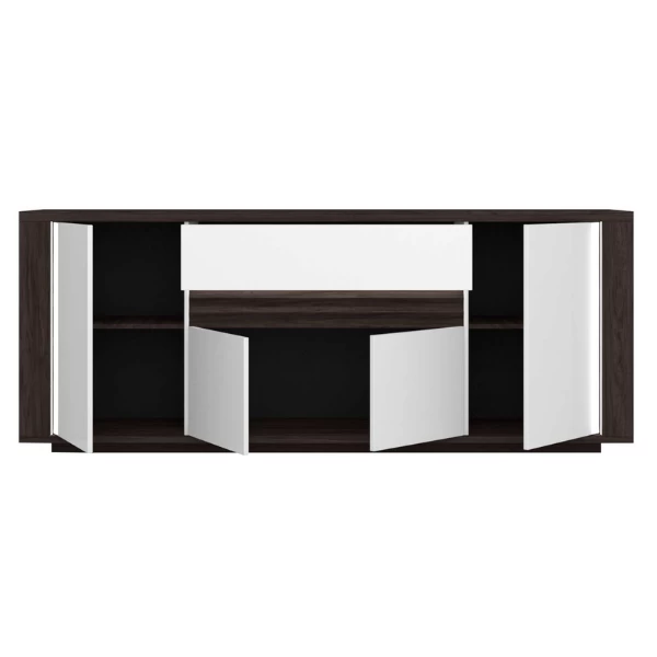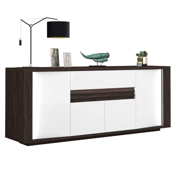 Les meubles de la collection Armin se caractérisent par leur design épuré et leurs finitions modernes et accrocheuses. Ce buffet est fabriqué en panneaux de particules dans un aspect bois foncé et une finition blanche brillante. Grâce aux quatre portes et au tiroir, il y a suffisamment de place pour ranger toutes sortes de choses de manière ordonnée. L’armoire gagne en caractère grâce à son design en accordéon et à son éclairage intégré. Découvrez les autres meubles de la collection Armin pour compléter votre intérieur.