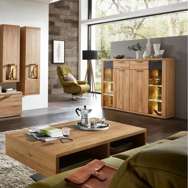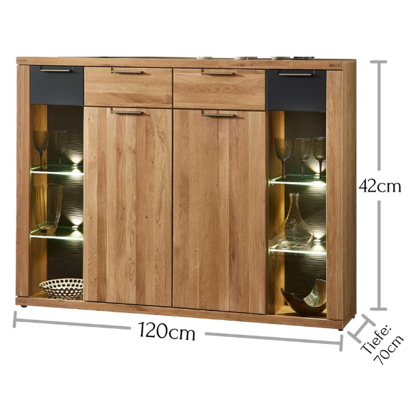 La collection Blanka est appréciée par de nombreuses personnes grâce à son design épuré et son aspect naturel dans un décor en chêne. Les détails de couleur anthracite ajoutent du caractère à la collection. Ce buffet est fabriqué en panneaux de particules avec un décor en chêne et une finition anthracite. Derrière les deux portes en bois se trouvent quatre étagères, ce qui vous permet de ranger toutes sortes de choses de manière ordonnée. L’armoire est également équipée de deux tiroirs afin que vous ayez de la place pour les petits objets. Derrière les deux portes vitrées, vous pouvez exposer vos plus beaux objets de décoration ou vos souvenirs. Grâce à l’éclairage LED intégré, votre collection sera encore plus mise en valeur. Combinez-les avec les autres meubles de la série Blanka et faites de votre salle à manger ou de votre salon un bel ensemble.