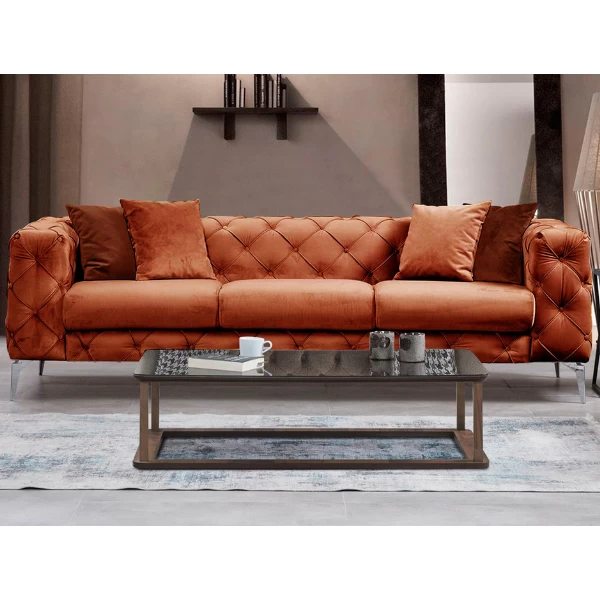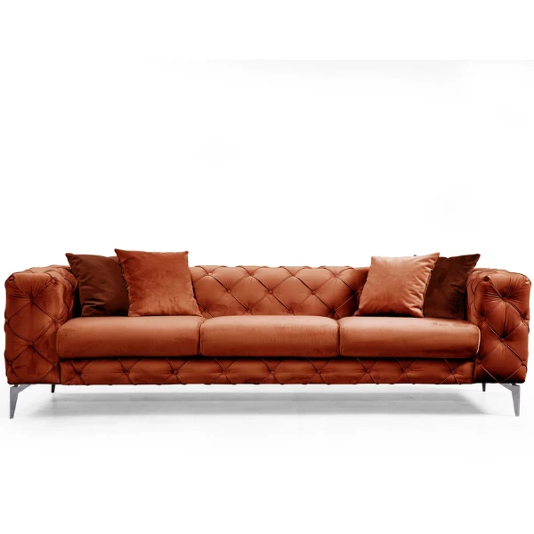 Êtes-vous prêt à transformer votre salon en un espace qui respire le confort et le style ? Ne cherchez pas plus loin que notre canapé 3 places ! Ce superbe meuble sera la star de votre salon, vous offrant le confort et le design unique que vous recherchez. Que vous receviez des invités ou que vous vous détendiez avec vos proches, ce canapé est le complément parfait pour sa combinaison de fonction et de mode.L’une des caractéristiques principales de notre Canapé 3 places est sa construction de haute qualité. Le cadre est fabriqué en bois de hêtre durable et en panneaux de particules, ce qui garantit la longévité et la stabilité. L’utilisation du bois de hêtre ajoute une touche d’élégance au design général, tandis que l’aggloméré fournit un support structurel. Le tissu utilisé pour ce canapé est 100 % polyester, ce qui offre non seulement un toucher doux et luxueux, mais aussi une grande facilité d’entretien. Un simple nettoyage à sec suffit pour que votre canapé conserve sa fraîcheur et son aspect neuf pendant des années. Avec une largeur de 237 cm, une hauteur de 73 cm et une profondeur de 90 cm, ce canapé 3 places offre un espace suffisant pour que vous et vos proches puissiez vous étendre et vous détendre. Les dimensions sont parfaites pour un salon de toute taille, ce qui en fait un choix polyvalent pour n’importe quelle maison. Le confort n’est pas compromis avec ce canapé. La mousse utilisée est une mousse grise de 5 cm 28 DNS pour l’assise, offrant un soutien ferme, et une plume de 5 cm 24 DNS pour le dossier, offrant une expérience moelleuse et confortable. La profondeur d’assise de 66 cm et l’épaisseur du coussin d’assise de 15 cm offrent un confort optimal pour les périodes d’assise prolongées. La hauteur du dossier de 70 cm offre un excellent soutien dorsal, ce qui vous permet de conserver une bonne posture lorsque vous vous prélassez ou que vous regardez la télévision. Les accoudoirs, d’une profondeur de 90 cm et d’une largeur de 27 cm, sont parfaits pour reposer vos bras et ajouter un confort supplémentaire.Le coussin d’assise portable et le coussin de dossier fixe ajoutent commodité et stabilité à l’ensemble. Vous pouvez régler la position du coussin d’assise selon vos préférences, tandis que le coussin de dossier fixe garantit qu’il reste en place même pendant une utilisation active.Les pieds du canapé sont en métal chromé, ajoutant une touche moderne et élégante à l’esthétique générale. Les pieds du canapé sont en métal chromé, ajoutant une touche moderne et élégante à l’esthétique générale.
