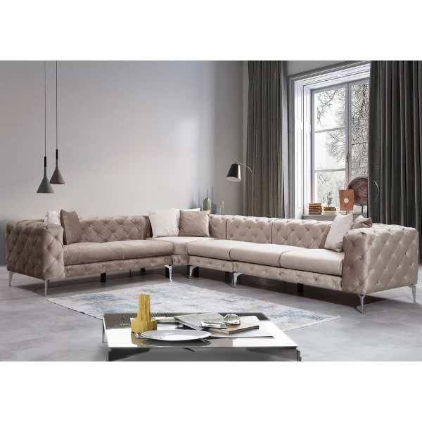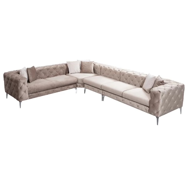 Vous êtes à la recherche d’un canapé d’angle qui donnera une nouvelle dimension à votre salon ? Ne cherchez plus, nous avons la pièce parfaite qui allie à la fois confort et design unique. Notre canapé d’angle est la star de n’importe quel espace, vous offrant l’équilibre parfait entre la fonction et la mode.L’une des principales caractéristiques de notre canapé d’angle est sa structure robuste. Fabriqué en bois de hêtre et en aggloméré, ce canapé est conçu pour durer. La combinaison de ces matériaux de haute qualité garantit la durabilité et la stabilité, de sorte que vous pourrez profiter de votre canapé pendant des années.Non seulement notre canapé d’angle est construit pour durer, mais il est également recouvert d’un tissu 100 % polyester. Ce tissu est non seulement facile à nettoyer, mais il confère également au canapé un aspect luxueux et élégant. Les dimensions de notre canapé d’angle sont impressionnantes, avec une largeur de 310 cm, une hauteur de 73 cm et une profondeur de 270 cm. Ces dimensions généreuses vous permettent de disposer de beaucoup d’espace pour vous et vos proches. Les confortables coussins en mousse sont un autre atout de ce canapé. Les coussins d’assise sont composés de 5 cm de mousse grise 28 DNS et de 5 cm de plume 24 DNS, offrant un mélange parfait de soutien et de douceur. Les coussins de dossier sont également composés de plumes de 24 DNS pour un confort accru. Pour améliorer encore votre confort, nous avons inclus deux coussins avec le canapé. Ces oreillers sont composés d’un mélange de 60 % de mousse coupée et de 40 % de mousse de silicone, ce qui garantit un soutien et une détente maximum. La taille de ces oreillers est de 45 cm x 45 cm, ce qui est parfait pour se blottir tout en regardant son film préféré ou en lisant un livre.Le nettoyage du canapé est un jeu d’enfant grâce à son tissu nettoyable à sec. Vous n’avez pas à vous soucier des déversements ou des taches qui ruinent la beauté de votre canapé. Les pieds de notre canapé d’angle sont une autre caractéristique remarquable. Fabriqués en métal noir mat, ces pieds ajoutent une touche de sophistication et de modernité à l’ensemble du design. Ils sont robustes et fiables, garantissant que votre canapé reste en place.Enfin, parlons de la couleur. Notre canapé d’angle est proposé dans une magnifique teinte beige, une option polyvalente qui s’accordera avec n’importe quel décor ou schéma de couleurs existant dans votre salon. La couleur neutre vous permet d’incorporer facilement d’autres meubles et accessoires sans dominer l’espace