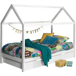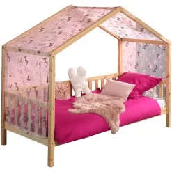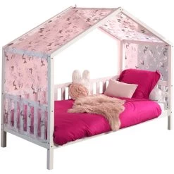 Lit Cabane Dallas 2 90×200, Tiroir De Lit & Voile Avec Dessin De Papillons – Nature/rose