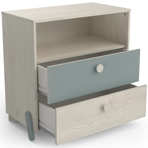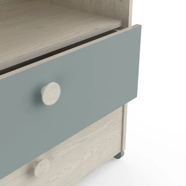 La douce palette de couleurs scandinaves de décor chêne Topanga et de gris-vert crée de la tranquillité dans la chambre d’enfant. Complétez avec les poignées ciriculaires et les pieds gris-vert ludiques et vous avez un chiffonnier magnifique! Dans les 2 tiroirs vous pouvez mettre des chausettes et des sous-vêtements. Dans la niche vous pouvez préparer la tenue pour une nouvelle journée scolaire ou vous pouvez personnaliser l’armoire en y mettant de chouettes décorations. La finition en peinture à l’eau fait que ce chiffonnier est respectueux à l’environnement et sûr pour les enfants. Combinez avec les autres meubles de la collection Ilyas et surprenez votre enfant avec la chambre de ses rêves! Les vis et les chevilles pour le montage mural ne sont pas inclus.