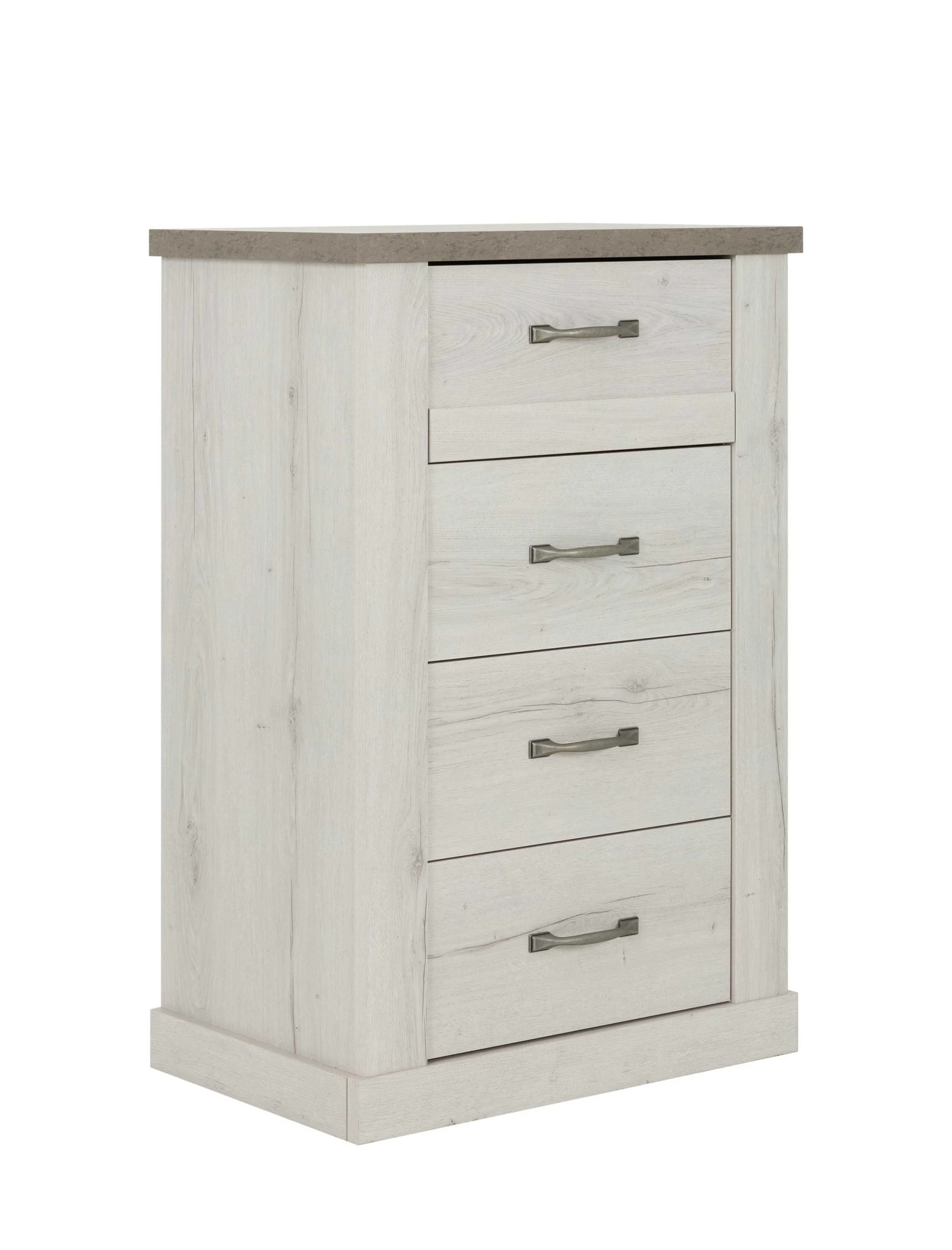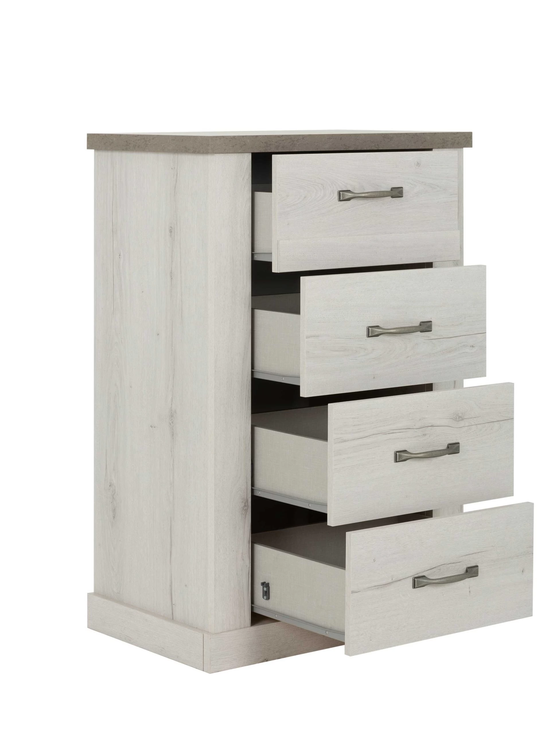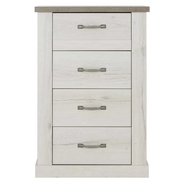 Ce chiffonnier est équipé de 4 tiroirs avec amortisseurs à la fermeture. Les poignées des tiroirs sont en métal avec une finition vieillie.