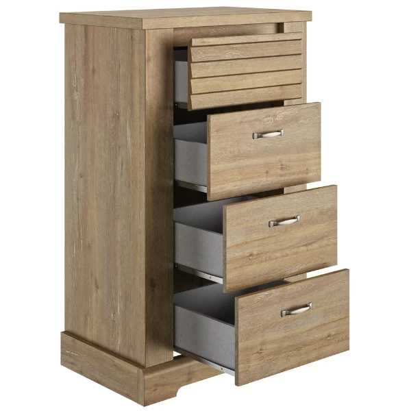 Ce chiffonnier pratique possède 4 tiroirs profonds avec amortisseurs. Le dessus du chiffonnier a une épaisseur de 35 mm.