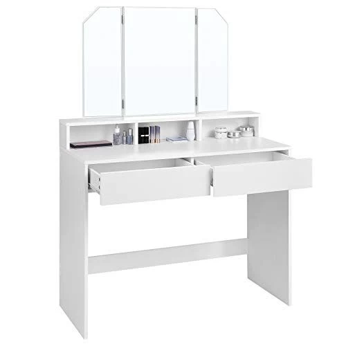 Cette table de coiffure moderne et élégante avec miroir pliable en trois parties est parfaite pour ceux qui recherchent une table de maquillage à la fois chic et pratique. Cette élégante table de toilette blanche est fabriquée en bois de wanple et en aggloméré avec un placage en mélamine, et constitue le moyen idéal d’intégrer votre style à votre routine de beauté quotidienne. Avec deux grands tiroirs et trois compartiments ouverts, vous pouvez ranger tous vos essentiels de maquillage.Cette coiffeuse a un design moderne et accrocheur qui vous donnera instantanément un coup de fouet lorsque vous vous assiérez devant elle. La beauté de cette table est qu’elle vous aidera à vous réinventer chaque jour.Rester au top de votre routine beauté est facile lorsque vous avez une coiffeuse qui est facile à nettoyer. L’emballage contient tout ce dont vous avez besoin pour assembler le produit : des pièces étiquetées, des instructions faciles à suivre, un kit anti-pointes et un kit d’accessoires. Commencez une toute nouvelle routine de beauté élégante avec cette coiffeuse moderne et élégante dotée d’un miroir pliable en trois parties.CARACTÉRISTIQUES ET AVANTAGES : -Le miroir pliable en trois parties vous permet d’admirer votre maquillage sous différents angles -Les grands tiroirs et les compartiments ouverts offrent des options de rangement pour tous vos produits cosmétiques -Le design moderne et l’aspect lumineux rehaussent le look de n’importe quelle pièce -Le revêtement en mélamine facile à nettoyer maintient la table en parfait état -Tout ce dont vous avez besoin pour assembler le produit est inclus -L’accessoire anti-pointes pour montage mural est inclus pour une sécurité et une stabilité accrues.