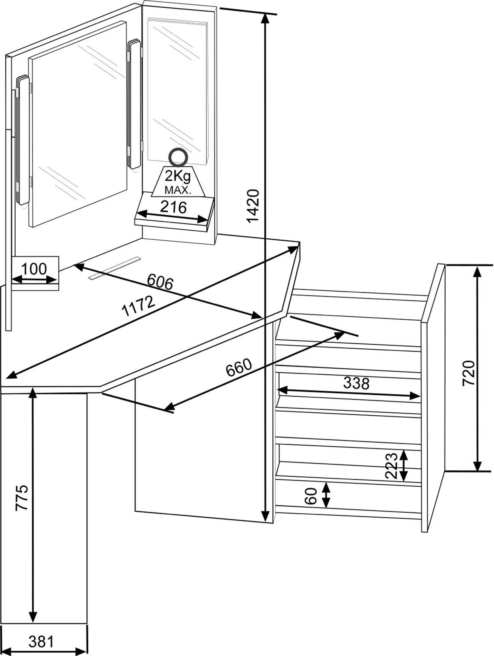 coiffeuse compte 3 miroirs, 2 petites tablettes (poids max. 2 kg), 1