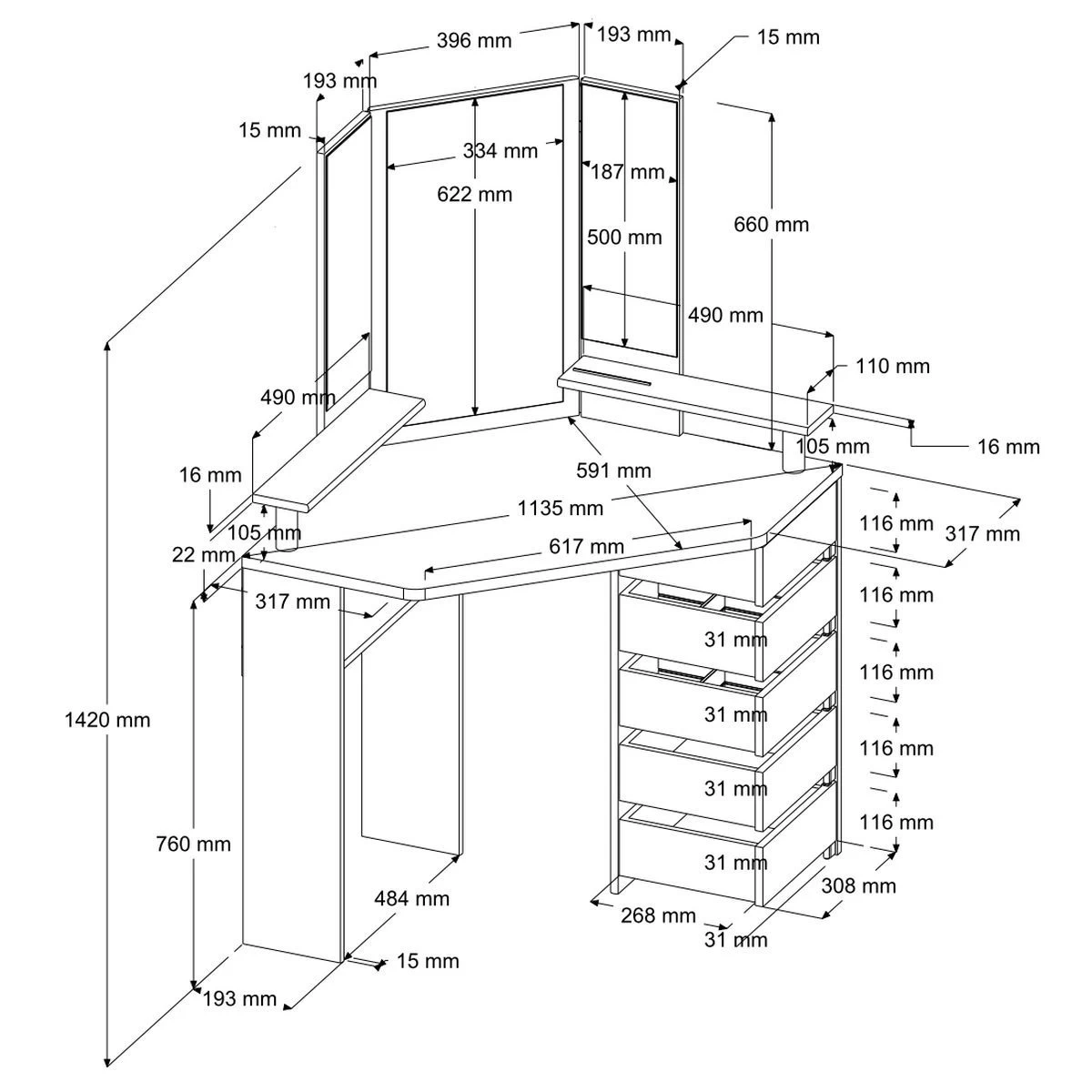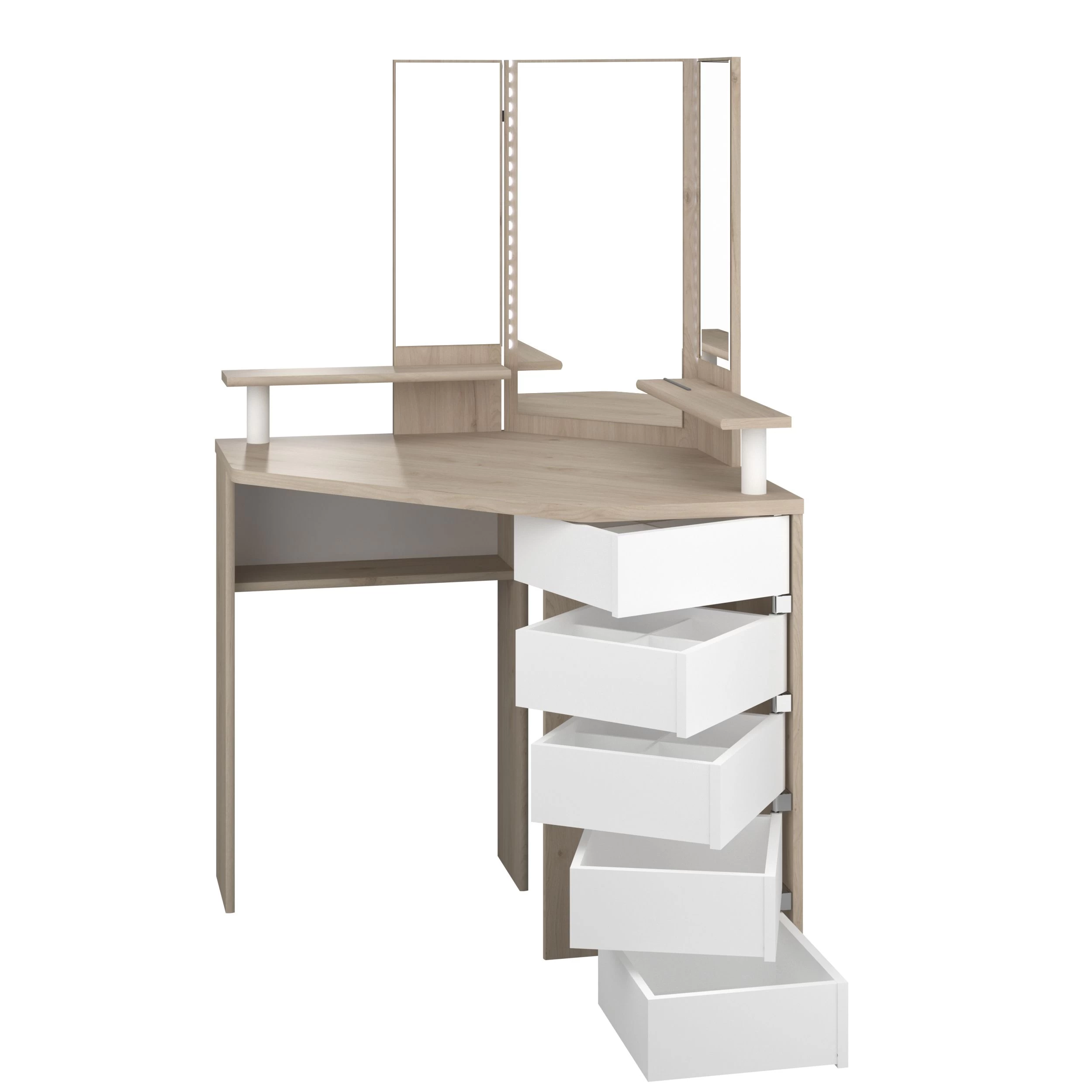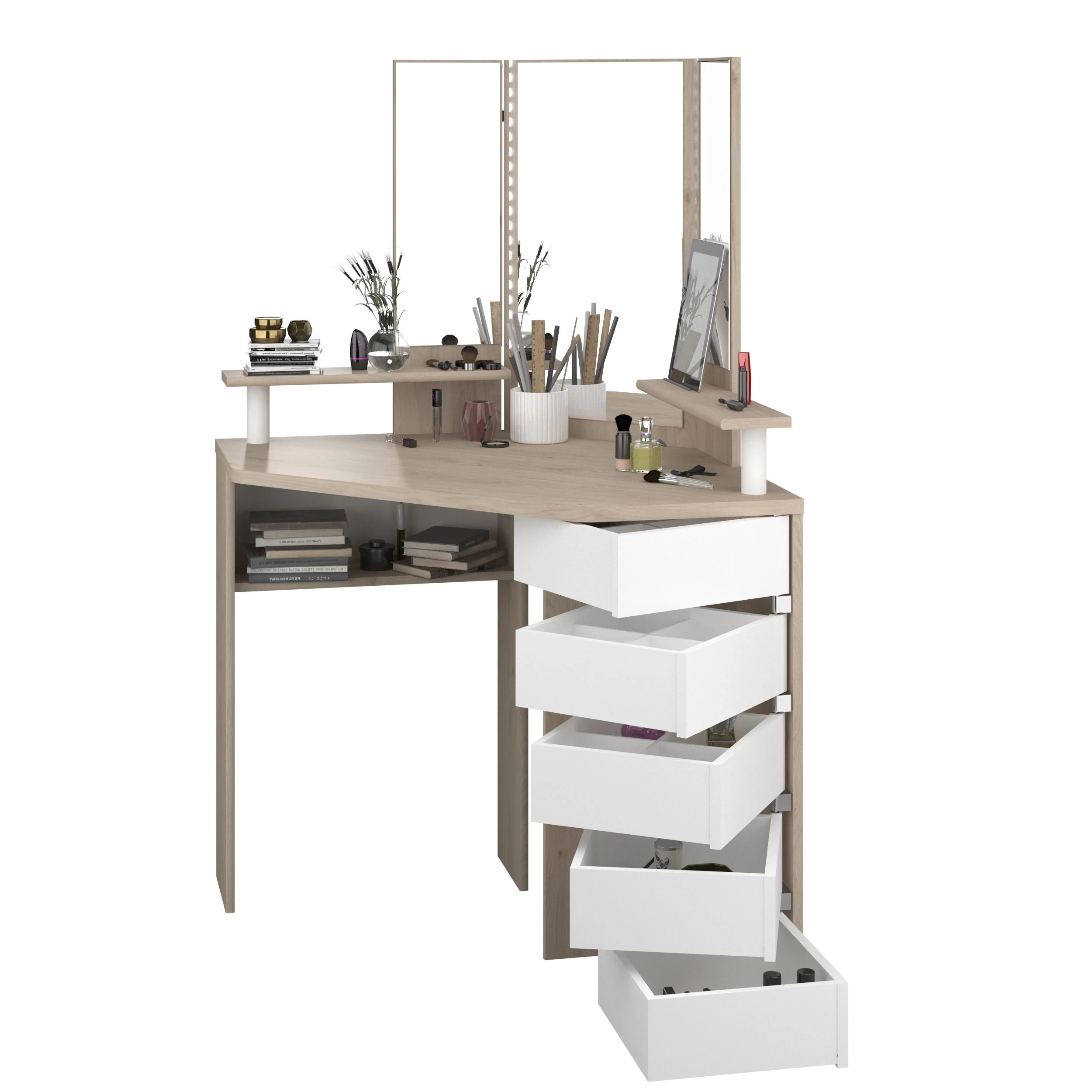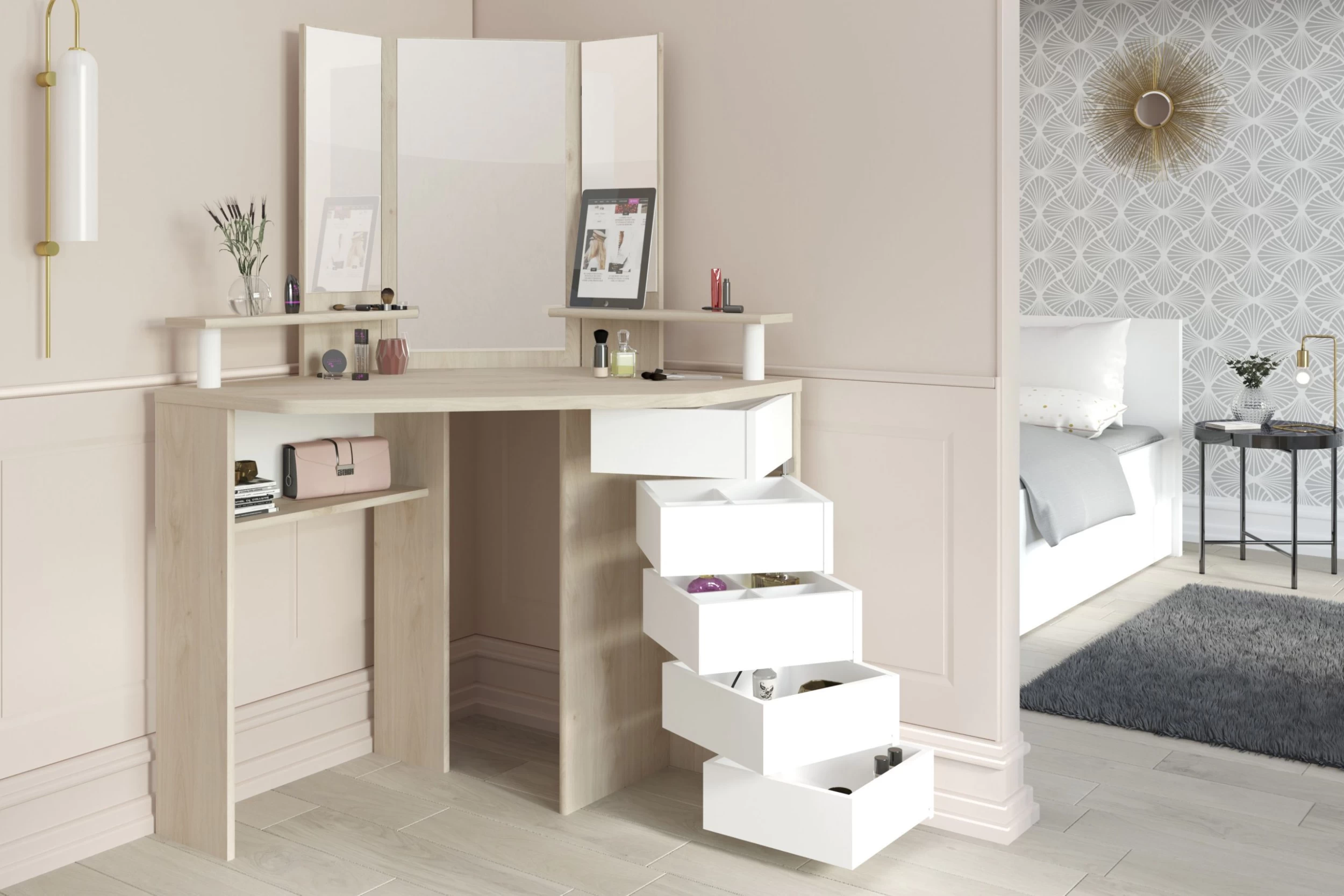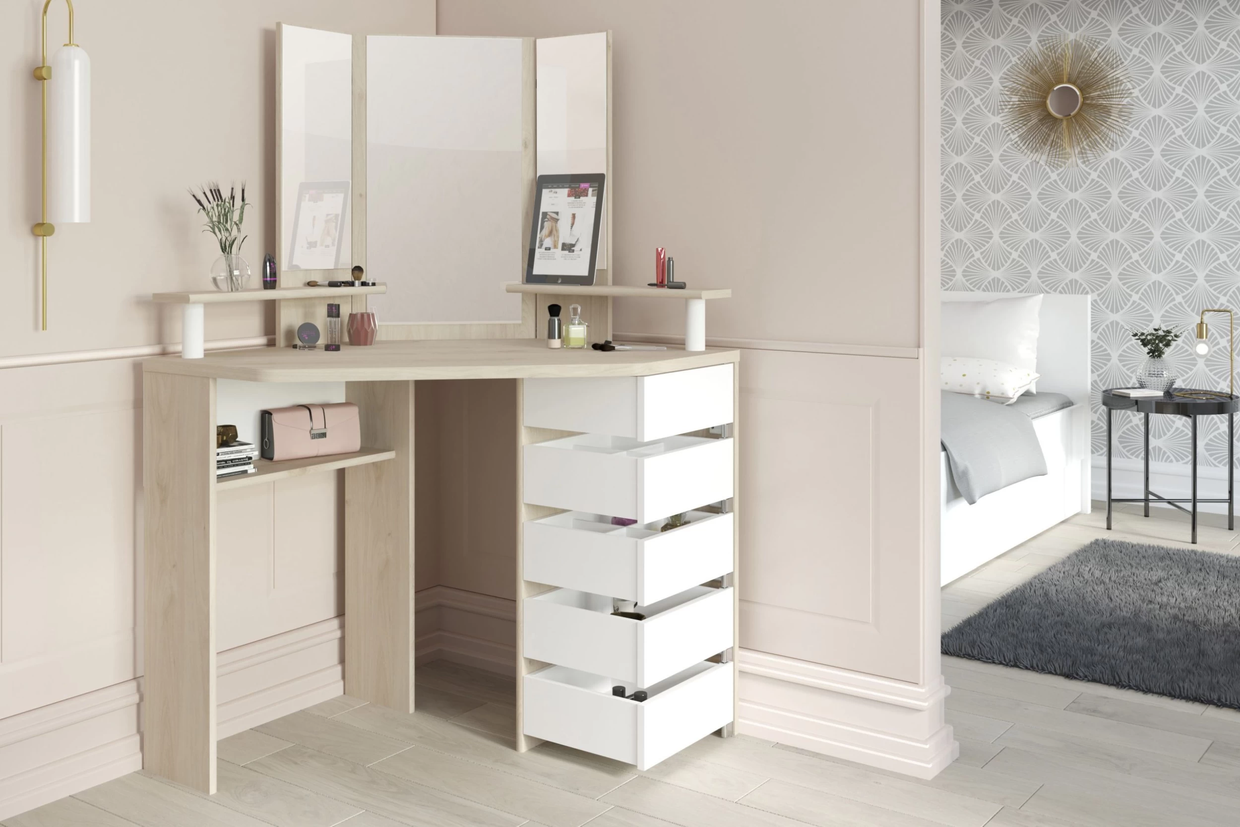 Commencez et terminez chaque journée en beauté assise derrière la jolie coiffeuse Douce. Installez-la dans un coin de votre chambre et créez votre propre coin beauté personnel. La coiffeuse est équipée d’un miroir, de 3 tablettes et de 5 tiroirs blancs. Vous ne manquerez pas de place pour ranger tous vos produits de beauté ! La coiffeuse douce est réalisée en panneaux de particules.