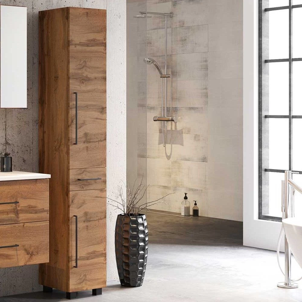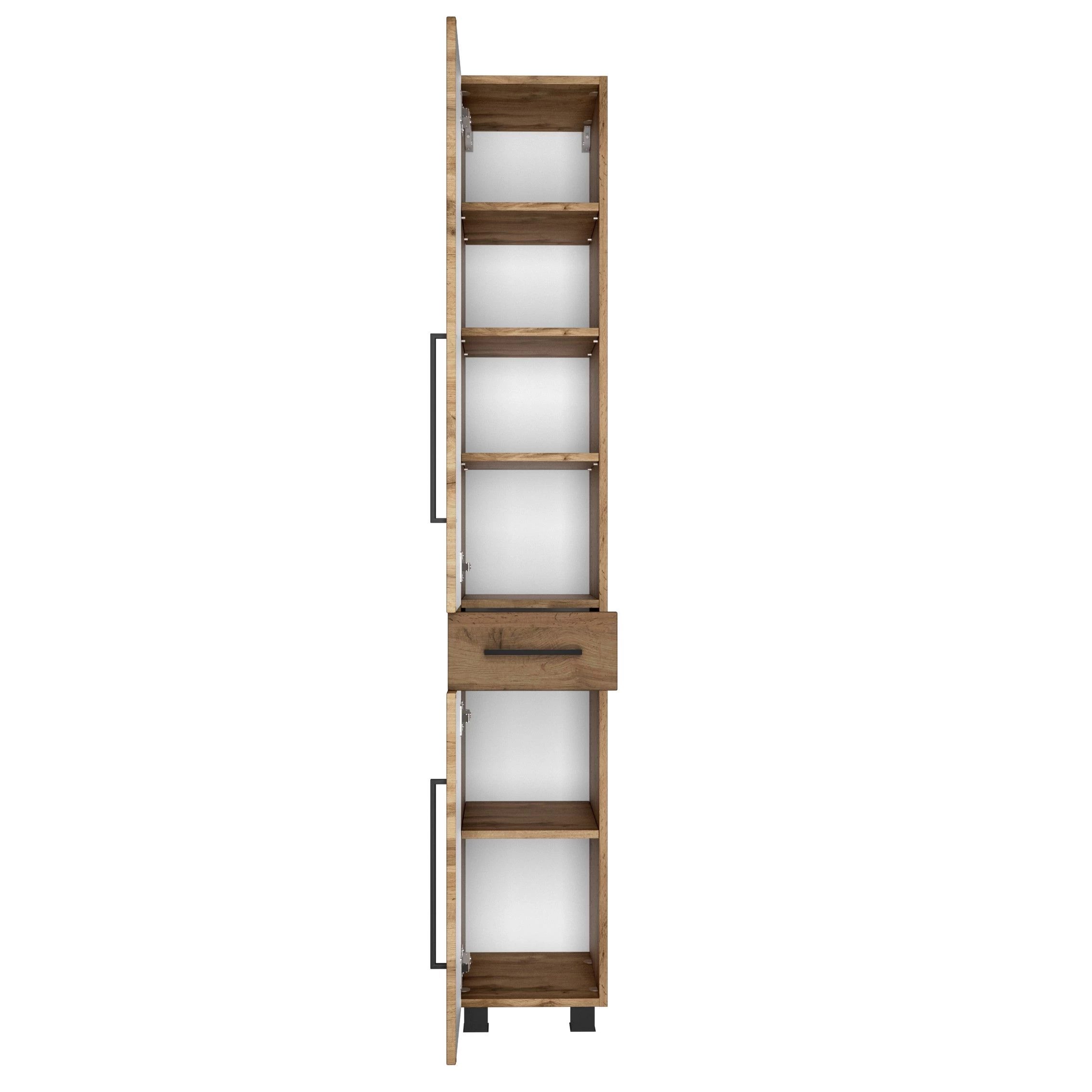 Grâce aux meubles de la collection Dusan, la salle de bains de vos rêves est toute proche. Les meubles en chêne wotan ont une finition noire, comme les poignées et les pieds de cette armoire. Le meuble est fabriqué à partir de panneaux de particules mélaminés et la façade est finie en MDF mat. L’armoire est équipée de deux portes tournantes et d’un tiroir à fermeture douce. A l’intérieur se trouvent au total quatre étagères.