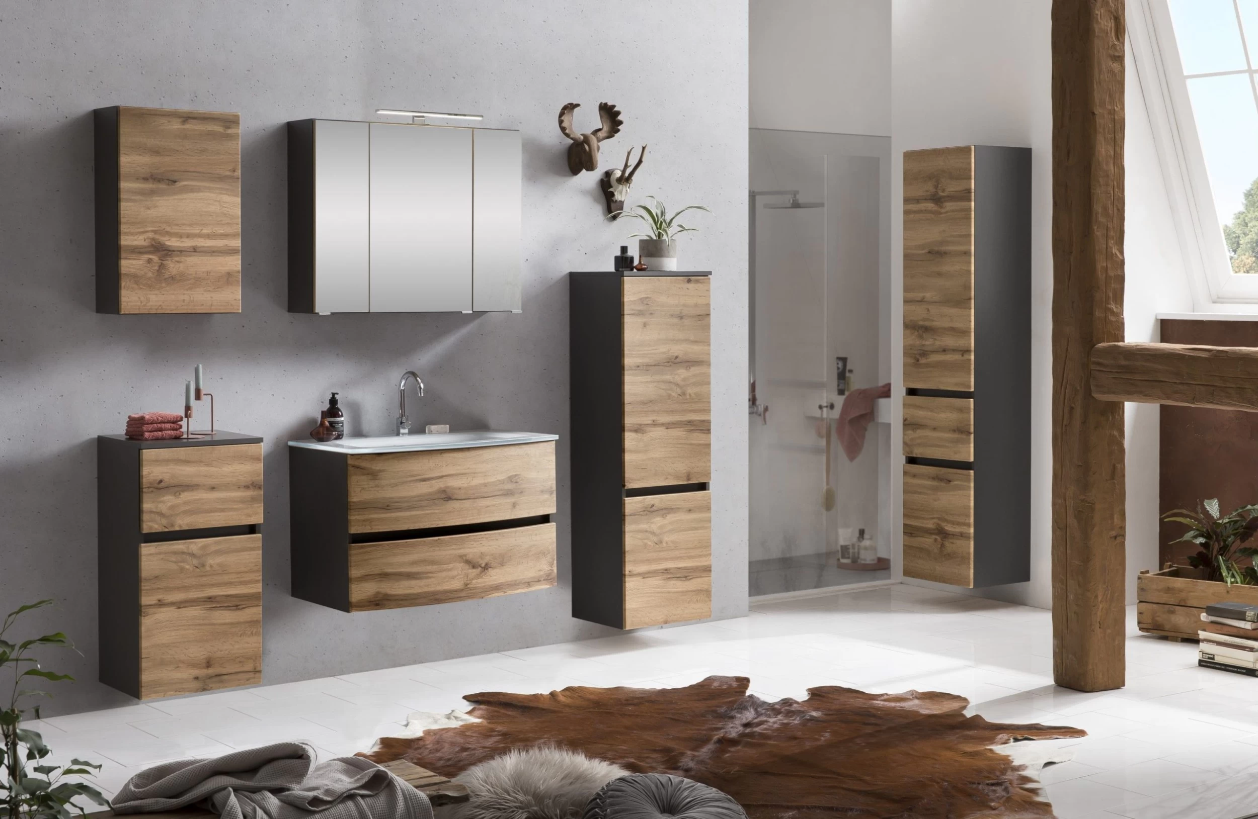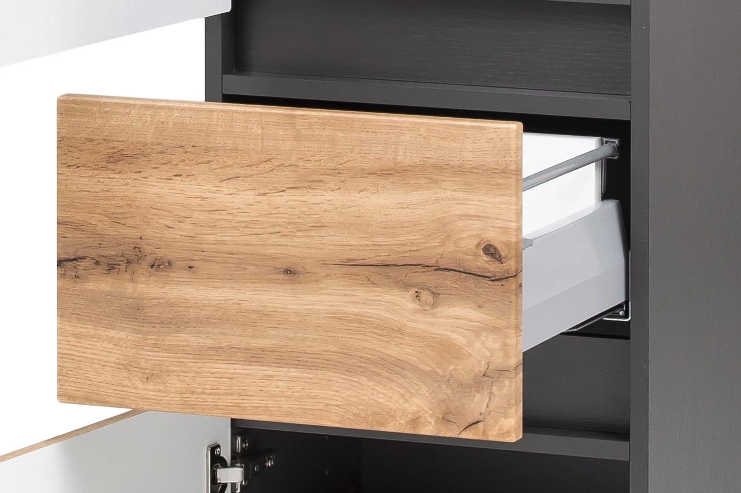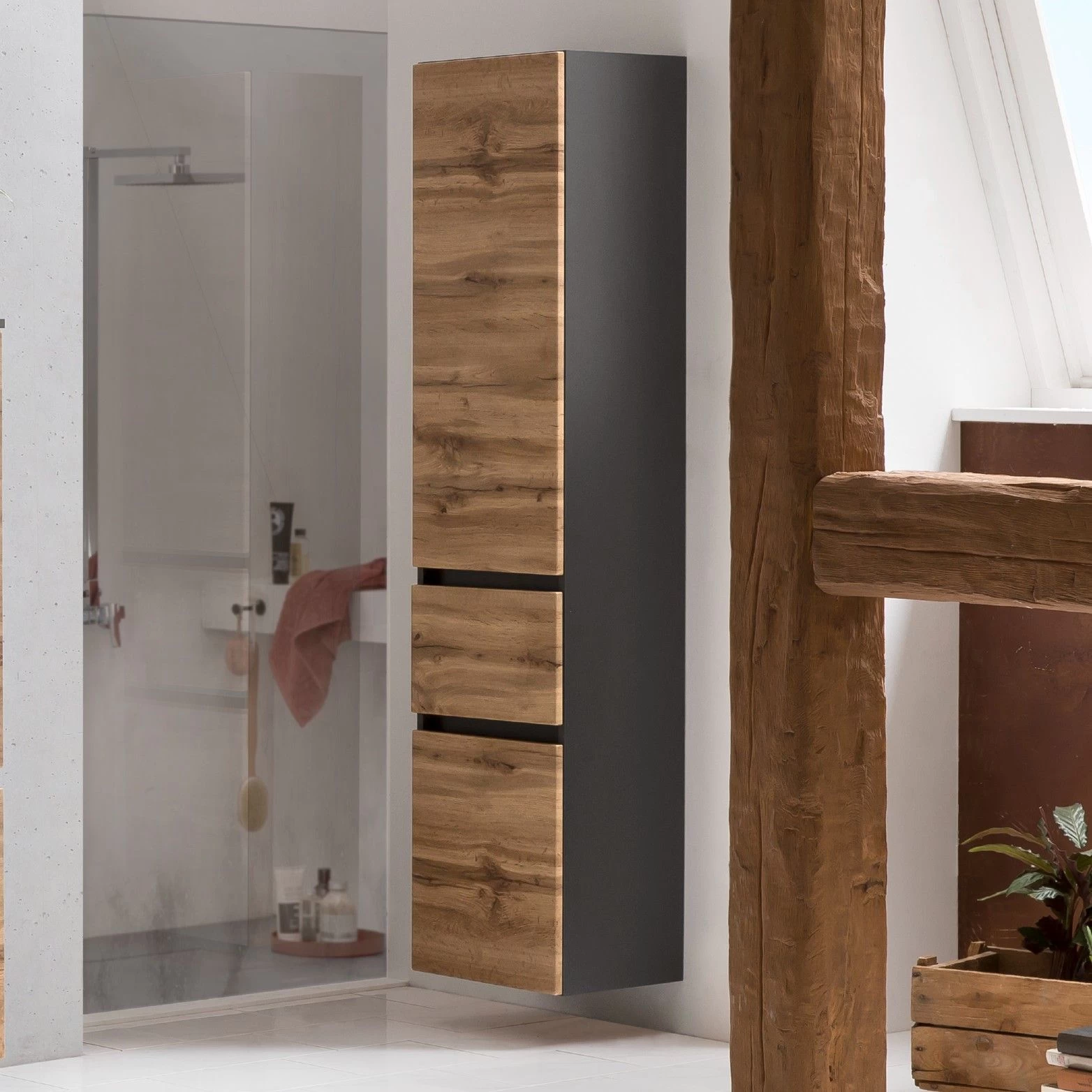 Les meubles de les collections Kornel et Luna vous permettent de combiner à l’infini pour créer votre salle de bains idéale. Cette colonne de salle de bains gris graphite a 40 cm de large et est réalisée en panneaux de particules mélaminés. Elle est équipée d’un tiroir à fermeture douce et de 2 portes, qui ont tous un décor en chêne. Grâce à son design sans prises de main, la colonne Kornel instaure une ambiance moderne et apaisante dans la salle de bains. Elle est également dotée de 4 étagères sur lesquelles vous pourrez ranger vos produits de soins, quelques accessoires ou des médicaments.