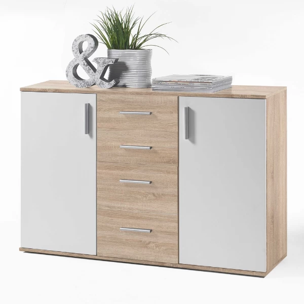 L’espace de rangement ne manquera pas avec la gamme Debby ! Elle se compose de plusieurs commodes de différentes tailles et de différents modèles. Toutes les armoires sont en aggloméré, et vous pouvez choisir entre un décor en béton ou un décor en chêne sonoma. Ce commode comporte deux portes tournantes, derrières lesquelles se trouve une étagère. Au milieu, il y a deux petits et deux grands tiroirs.