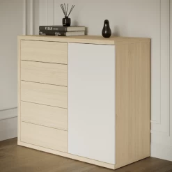 Le décor chêne clair magnifique et la conception simple de la commode Helena auront un effet apaisant dans votre chambre à coucher. La porte en blanc fournit l’amoire d’une touche moderne. Dans les 5 tiroirs vous pouvez mettre des chaussettes, des sous-vêtements ou des foulards et d’autres accessoires. Derrière la porte tournante il se trouve également une tringle où vous pouvez par exemple accrocher queleques chemises ou pantalons. Cette armoire est réversible de sorte qu’elle se combine facilement avec les autres armoires de la collection. Vis et chevilles pour montage mural non-incluses.