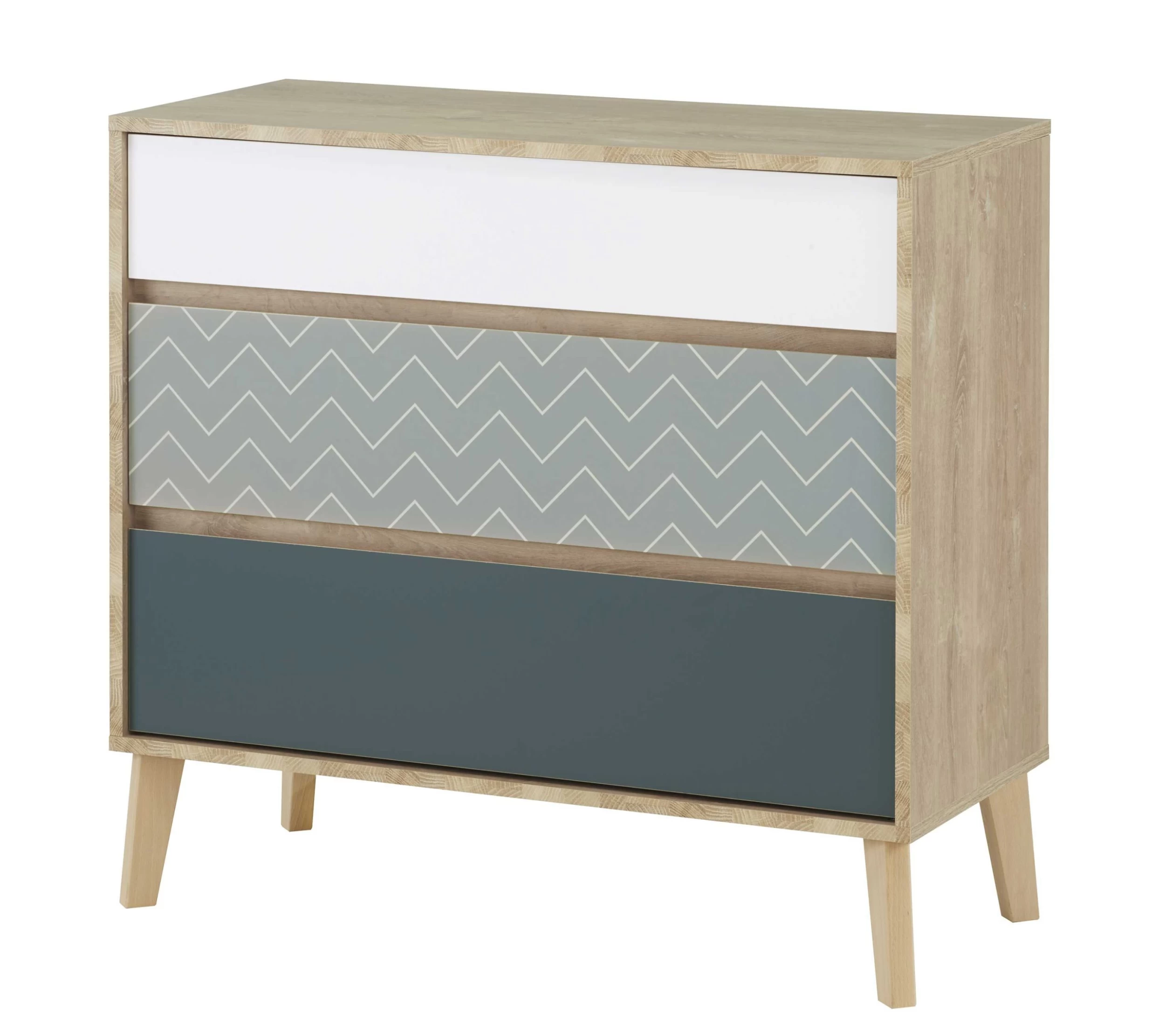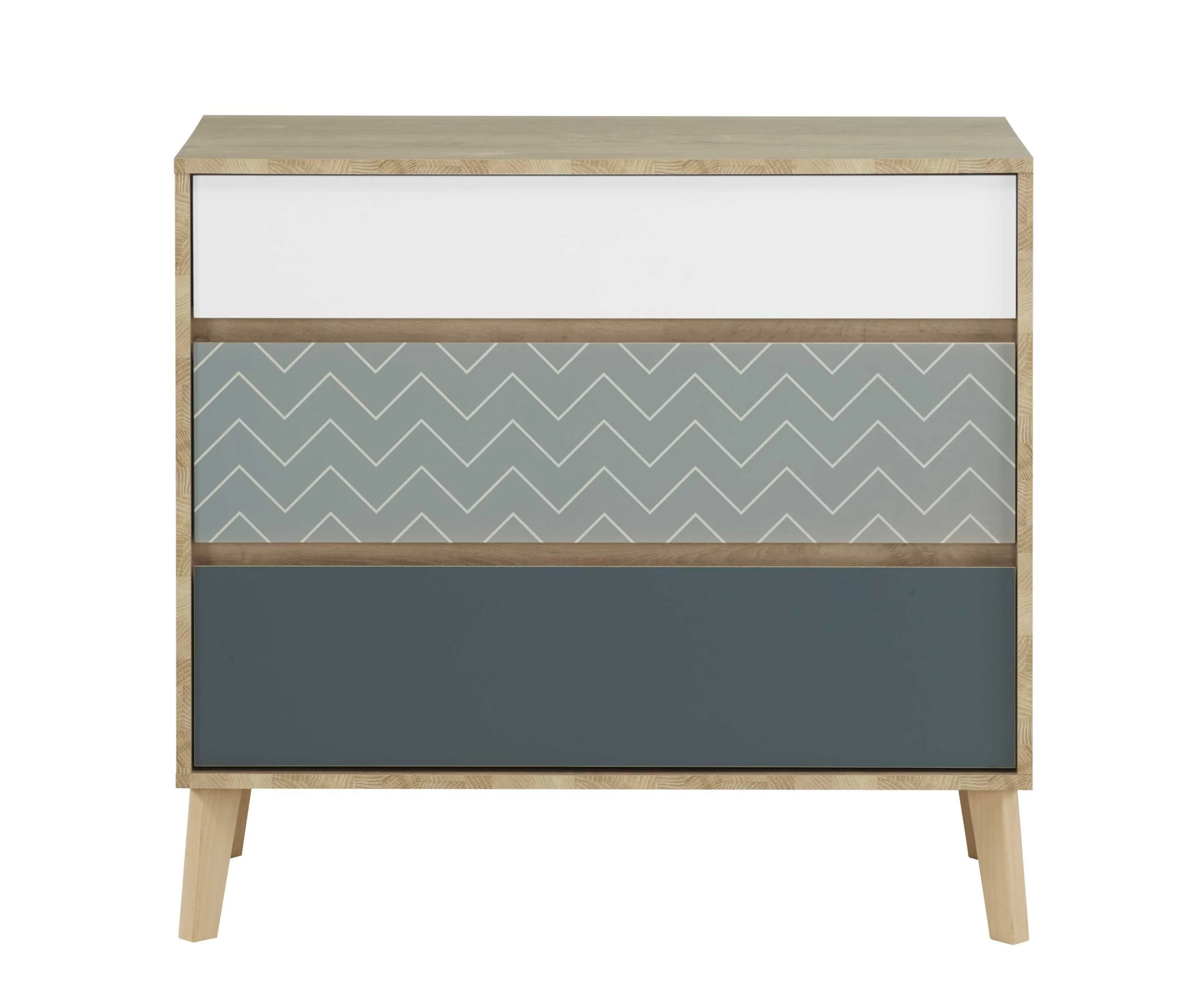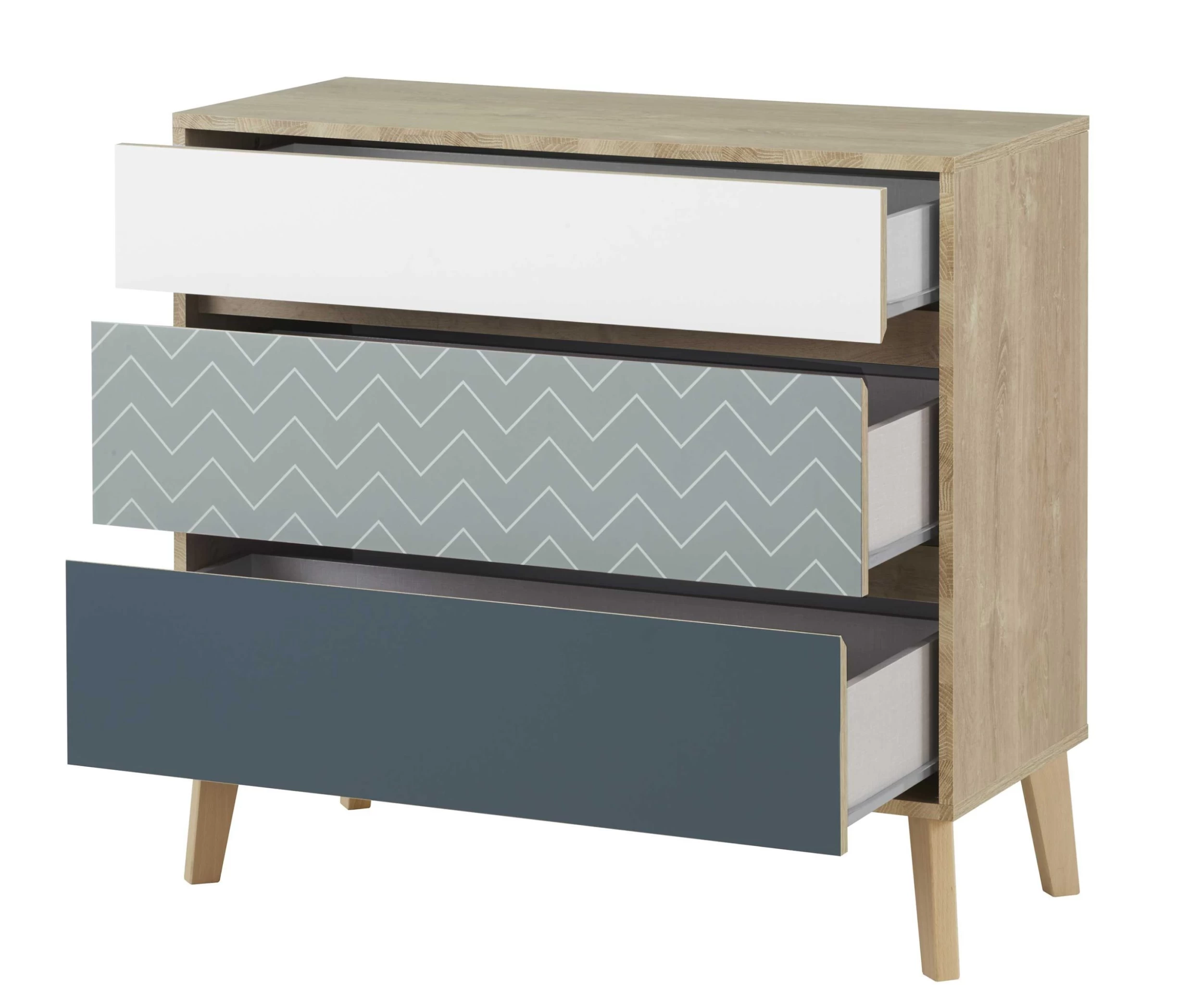 Les 3 tiroirs de cette commode renferment un bel espace de rangement pour ranger vos T-shirt, pulls et autres vêtements. Les tiroirs sont tous dotés d’une autre couleur (blanc, bleu de cobalt et bleu océan avec motif à chevrons), apportant une touche particulière à la chambre.