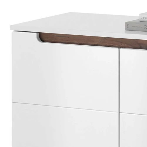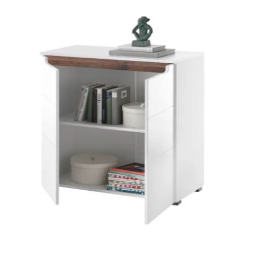 Soigné et ordonné, voilà ce qu’est la collection Nuro. Les meubles modernes sont fabriqués en MDF avec une finition blanche brillante. Les poignées ont un accent de bois foncé. Cette commode comporte deux portes tournantes avec une étagère à l’intérieur.