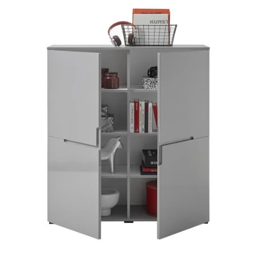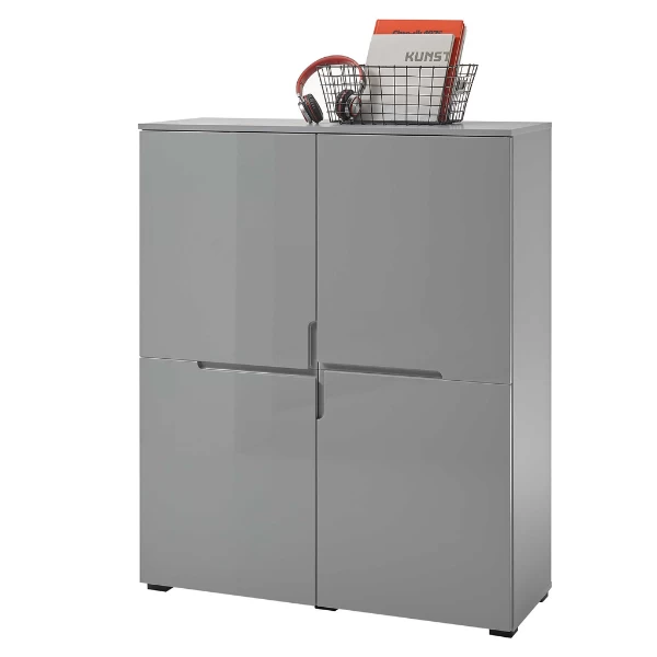Vous avez besoin d’un espace de rangement supplémentaire et vous cherchez une solution élégante ? Jetez un coup d’œil à la gamme Seta et choisissez la ou les commodes que vous préférez. Les différent modèles sont fabriqués en panneaux de particules et sont finis en gris brillant. Ce commode comporte deux portes tournantes avec quatre compartiments de rangement de chaque côté.