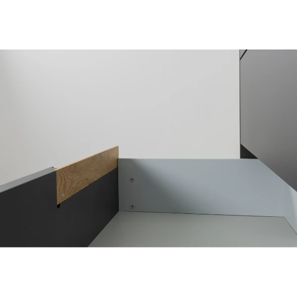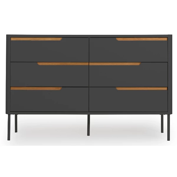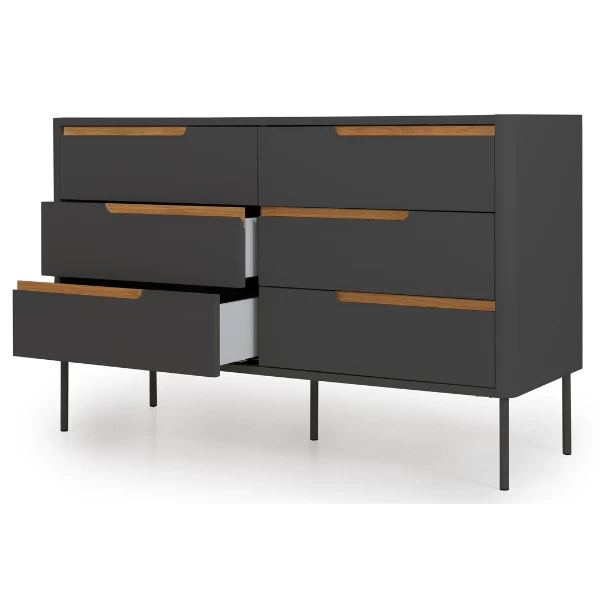 Avec leur simplicité, leurs lignes épurées et leurs couleurs classiques, les meubles de la collection Switch s’intègrent parfaitement aux intérieurs modernes et minimalistes. Les concepteurs ont choisi de donner aux meubles une couleur blanche, vert forêt ou anthracite et d’ajouter des détails en chêne, des combinaisons qui se sont avérées très réussies et qui plairont à tous. Les armoires sont également dotées de poignées asymétriques et de tiroirs équipés d’un système de fermeture souple. Cette commode moderne est équipée de 6 tiroirs. Il offre beaucoup d’espace de rangement et est donc parfait pour le couloir, la chambre ou le dressing. Si les armoires peuvent parfois sembler peu maniables, ce n’est pas le cas de cette armoire grâce à ses coins arrondis et à ses pieds métalliques fins. Un autre avantage de cette armoire est que les tiroirs sont équipés d’un système de fermeture souple, ce qui vous évite de réveiller les autres personnes de la maison lorsque vous attrapez vos vêtements. Le haut et le bas de cette commode sont fabriqués en aggloméré, les côtés en MDF et les pieds en métal. L’ensemble de l’unité est fini avec des détails en chêne. Spécifications:Dimensions du tiroir : 56×36.5×13/15.5 cmUtilisation : à l’intérieur uniquement, ne pas placer en plein soleil ou dans un endroit humide.Nettoyage : à l’eau et au savon. Sécher avec un chiffon doux et sec. Pour les taches difficiles à enlever, consultez un spécialiste.