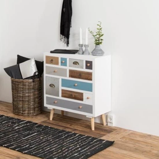 Cette commode Tiara est équipée de 11 tiroirs de différentes couleurs et tailles. Fabriquée en pin massif et en MDF, cette commode est très stable. Vous pouvez placer cette commode à la fois dans votre salon et dans votre chambre à coucher.