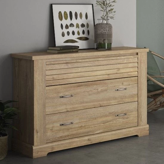 Cette commode a une hauteur de 91 cm pour un rangement optimal. Les 3 tiroirs de la commode sont dotés d’amortisseurs.