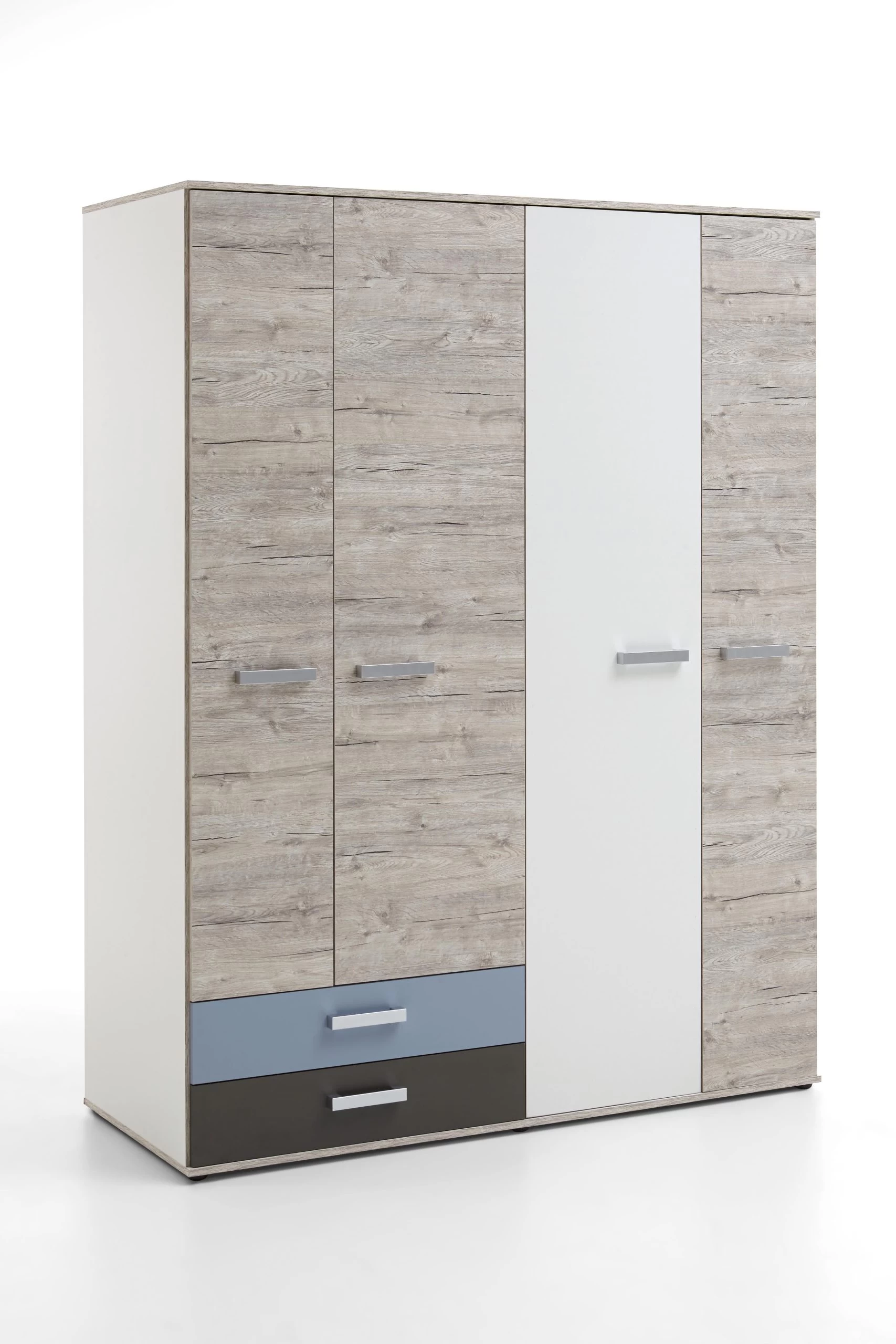 La garde-robe Nano doit son look unique au contraste entre les différentes couleurs (chêne gris, blanc, gris et bleu). L’armoire compte 4 portes et 2 tiroirs. Les tiroirs sont très pratiques pour bien ranger et organiser des sous-vêtements ou des chaussettes, par exemple. La garde-robe est réalisée en panneaux de particules. Découvrez toute la collection Nano sur notre site !