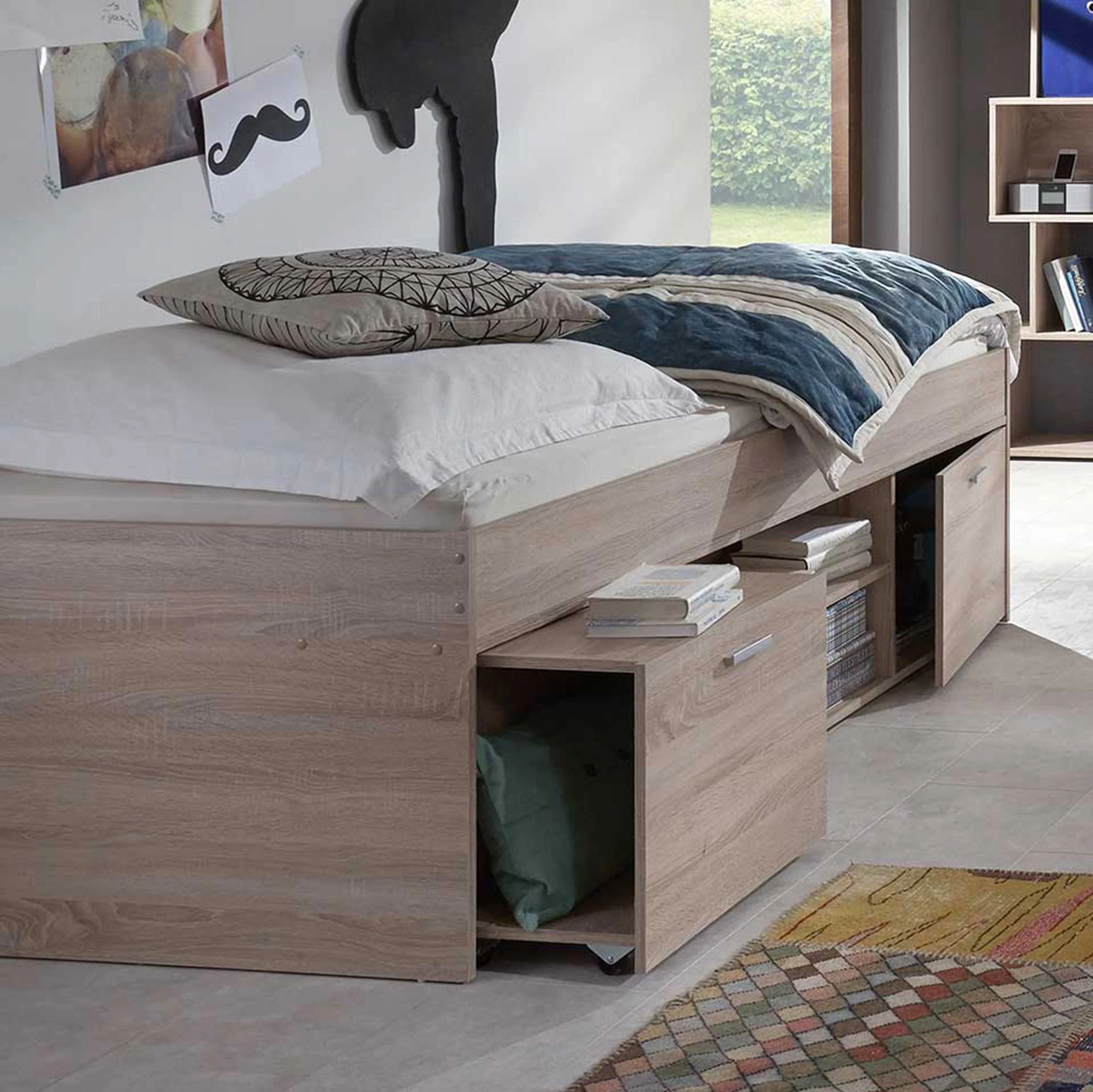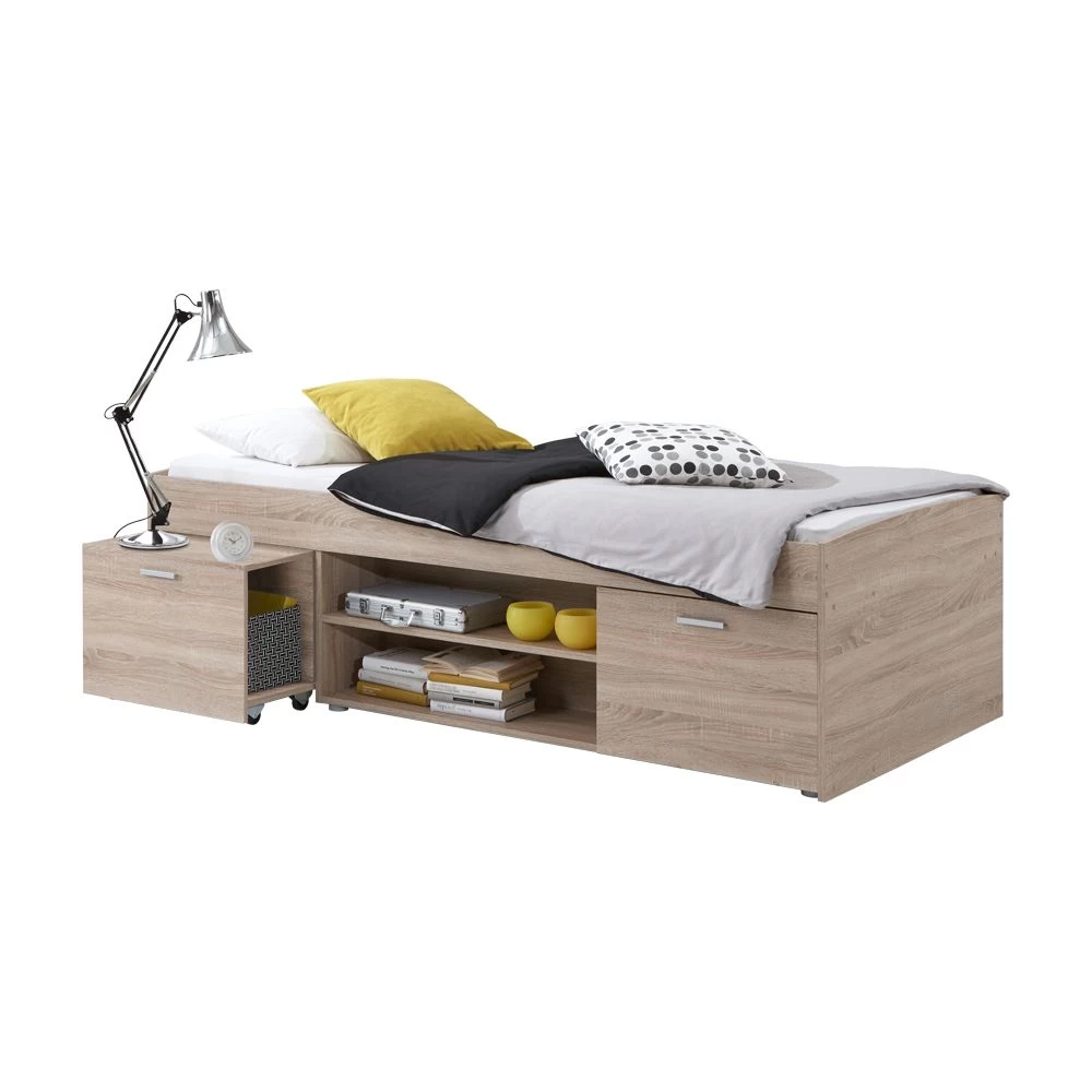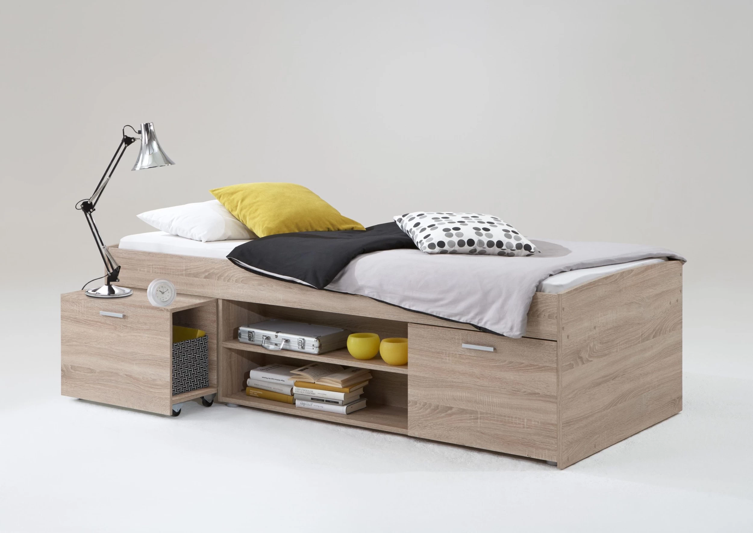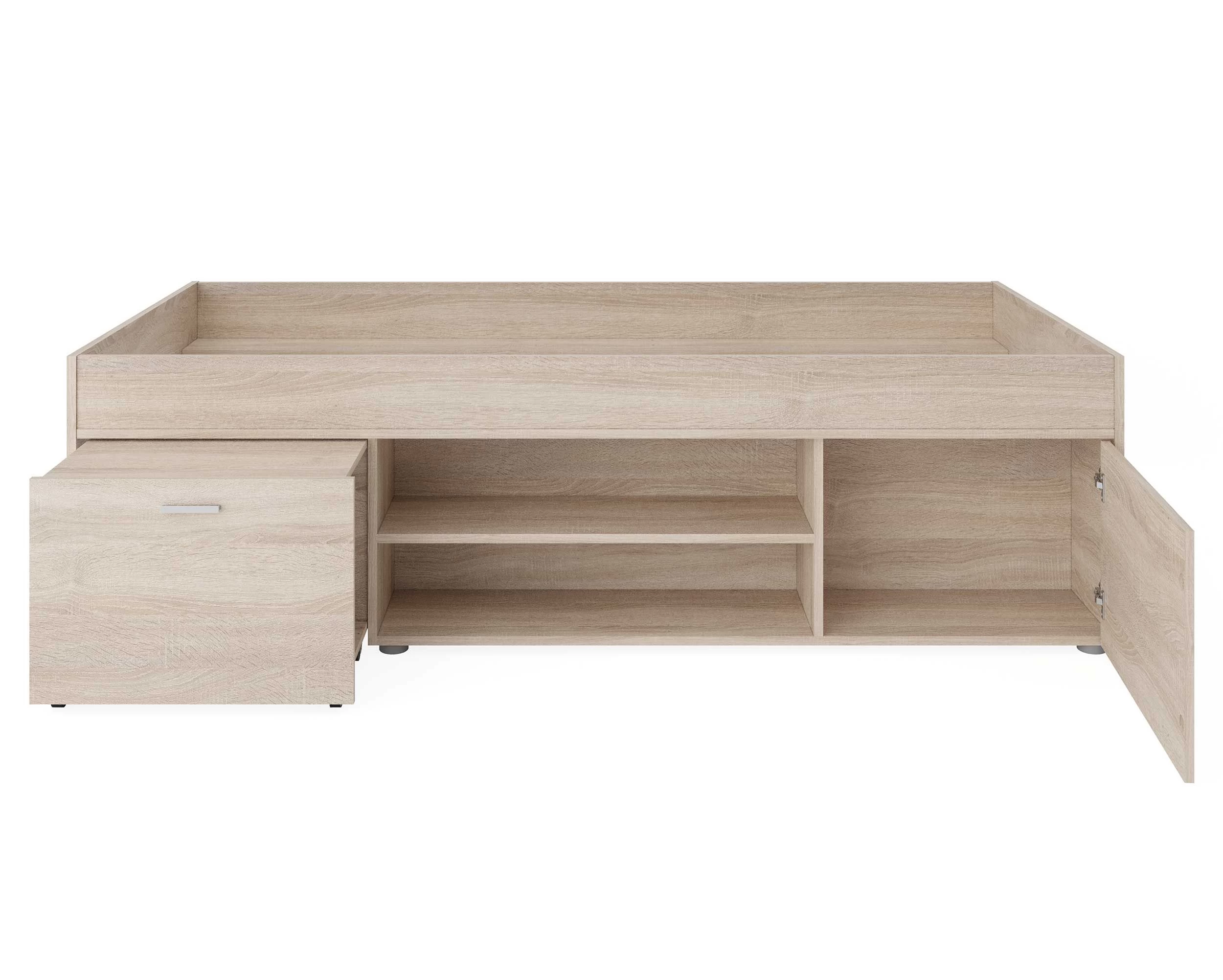 Surprenez votre bout de chou avec ce lit capitaine Carlo au décor chêne. Ce lit moderne est doté d’un espace de rangement en bas, qui se compose d’une petite armoire avec porte, de 2 compartiments et d’une table de chevet sur roulettes que vous pouvez caser sous le lit si vous n’en avez pas besoin.