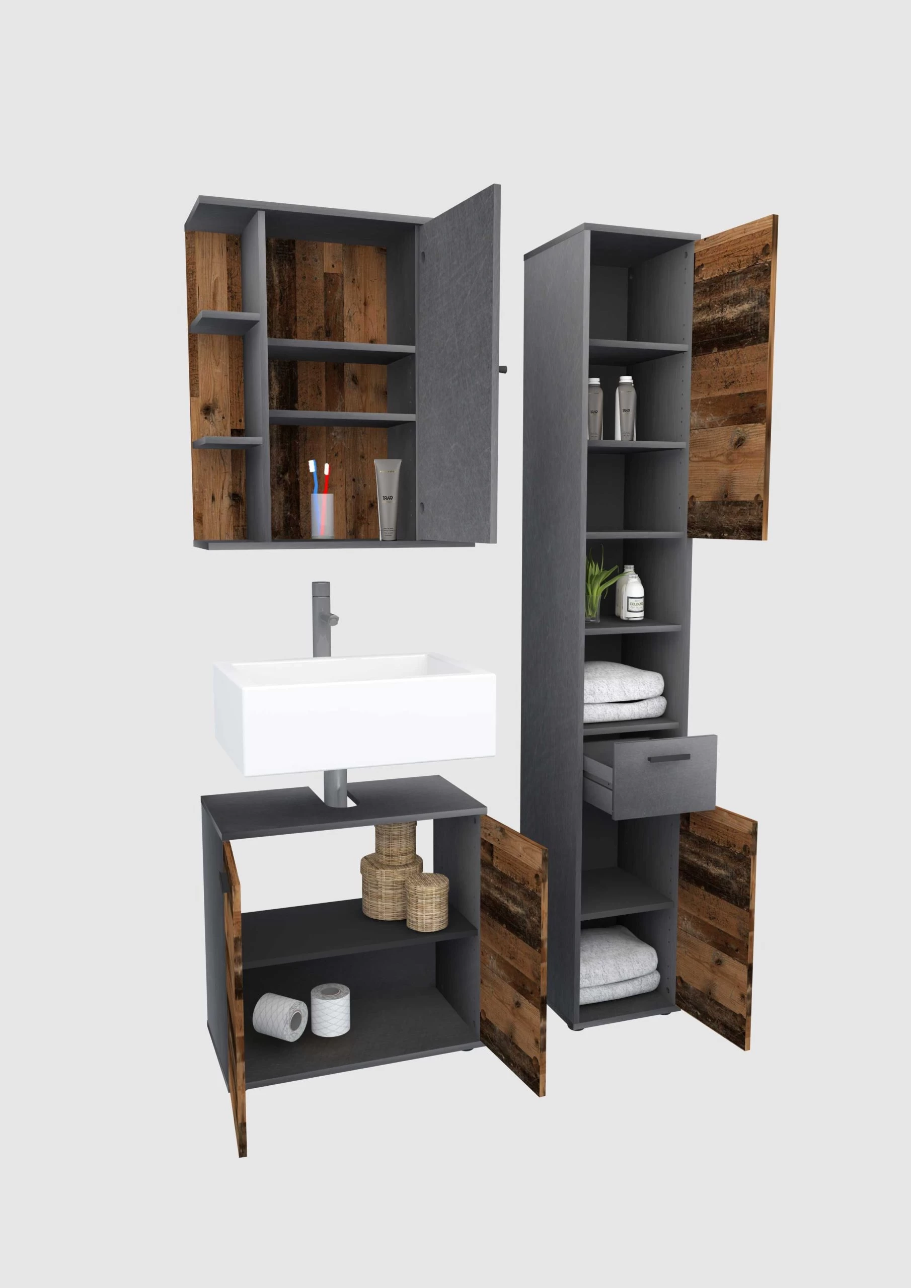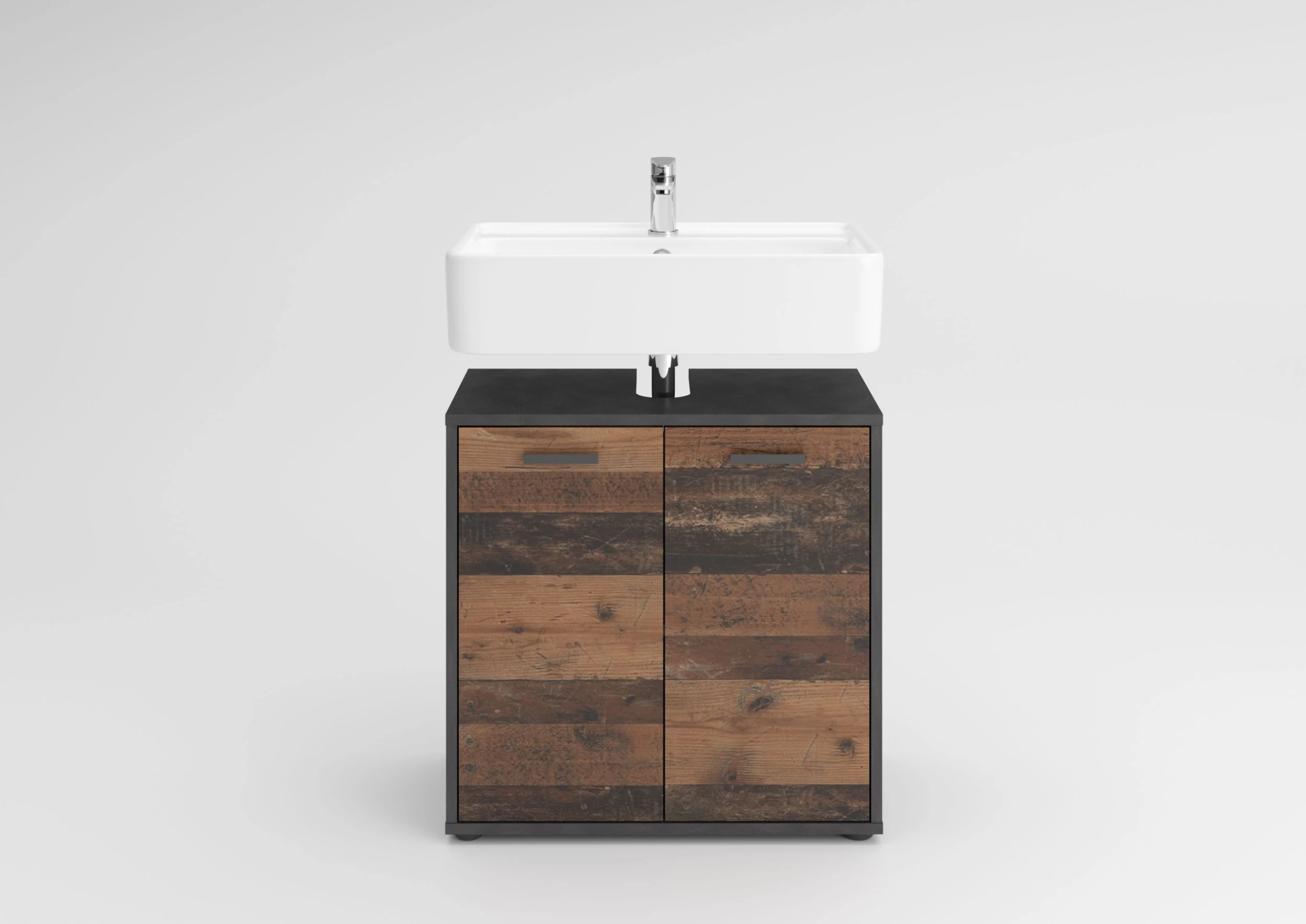 Les meubles de la collection Madoc vous permettent de créer une salle de bains qui a de l’allure grâce à son décor en bois vieilli. Les détails en gris foncé apportent une touche moderne au meuble et se combinent merveilleusement avec le décor en bois.