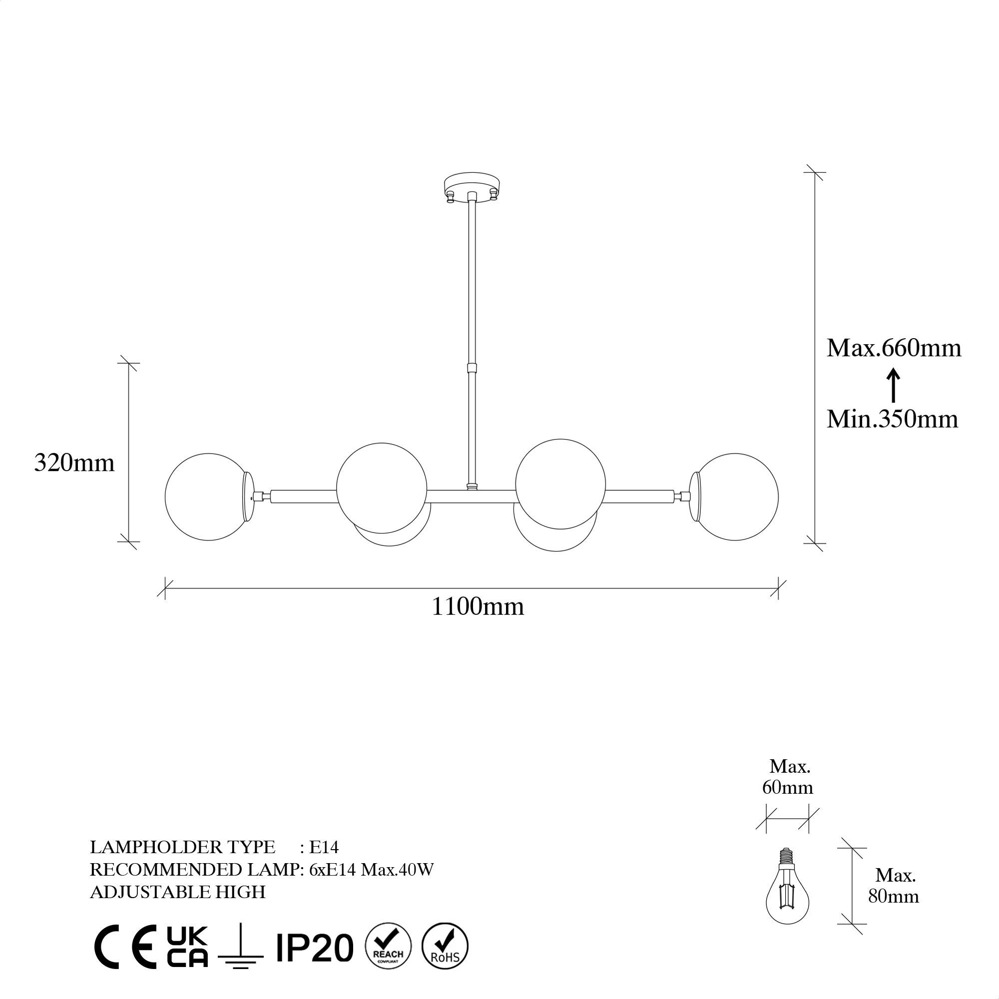 Le lustre Fulgor est un chef-d’œuvre d’élégance et de sophistication. Il est composé d’un corps en métal et d’une magnifique calotte en verre. Fabriqué avec un corps en métal et orné d’une magnifique calotte en verre, ce lustre ne manquera pas d’ajouter une touche de glamour à n’importe quel espace.L’une des principales caractéristiques du lustre Fulgor est sa plaque de base en métal, qui non seulement rehausse son esthétique générale, mais lui confère également stabilité et durabilité. La plaque de base a un diamètre de 12 cm et une hauteur de 3 cm, ce qui garantit une installation équilibrée et sûre.Pour ajouter à son allure, le lustre Fulgor est équipé de six capuchons en verre, chacun ayant un diamètre de 15 cm. Ces bouchons sont fournis par six, ce qui renforce encore l’attrait visuel du lustre. Avec ses dimensions de 110 x 40 x 35-66 cm, le lustre Fulgor est un complément idéal pour les grands espaces tels que les salons, les salles à manger ou même les grandes entrées. Sa hauteur réglable permet de le personnaliser et de s’assurer qu’il s’intègre parfaitement dans l’environnement souhaité.Le lustre Fulgor n’est pas seulement d’une beauté exquise, il offre également des avantages fonctionnels. Avec un indice de protection IP20, il est protégé contre les objets solides et les particules de plus de 12,5 mm, ce qui permet de l’utiliser à l’intérieur. De plus, le lustre Fulgor est doté d’une douille de 6 x E14, ce qui permet une puissance maximale de 40 W par ampoule. Le lustre Fulgor est doté d’une douille de type 6 x E14, ce qui permet d’utiliser une puissance maximale de 40 W par ampoule. Que vous organisiez un dîner ou que vous passiez simplement une soirée tranquille à la maison, le lustre Fulgor crée l’ambiance parfaite.En conclusion, le lustre Fulgor est un véritable chef-d’œuvre qui allie l’élégance intemporelle à la praticité. Son corps en métal, ses caches en verre, sa hauteur réglable et son design d’inspiration vintage contribuent tous à son attrait visuel exceptionnel. Avec ses avantages fonctionnels tels que la protection IP20 et un éclairage important, ce lustre est le choix idéal pour rehausser le style et l’atmosphère de n’importe quel espace. Découvrez la beauté du lustre Fulgor et transformez votre maison en un sanctuaire de luxe raffiné.