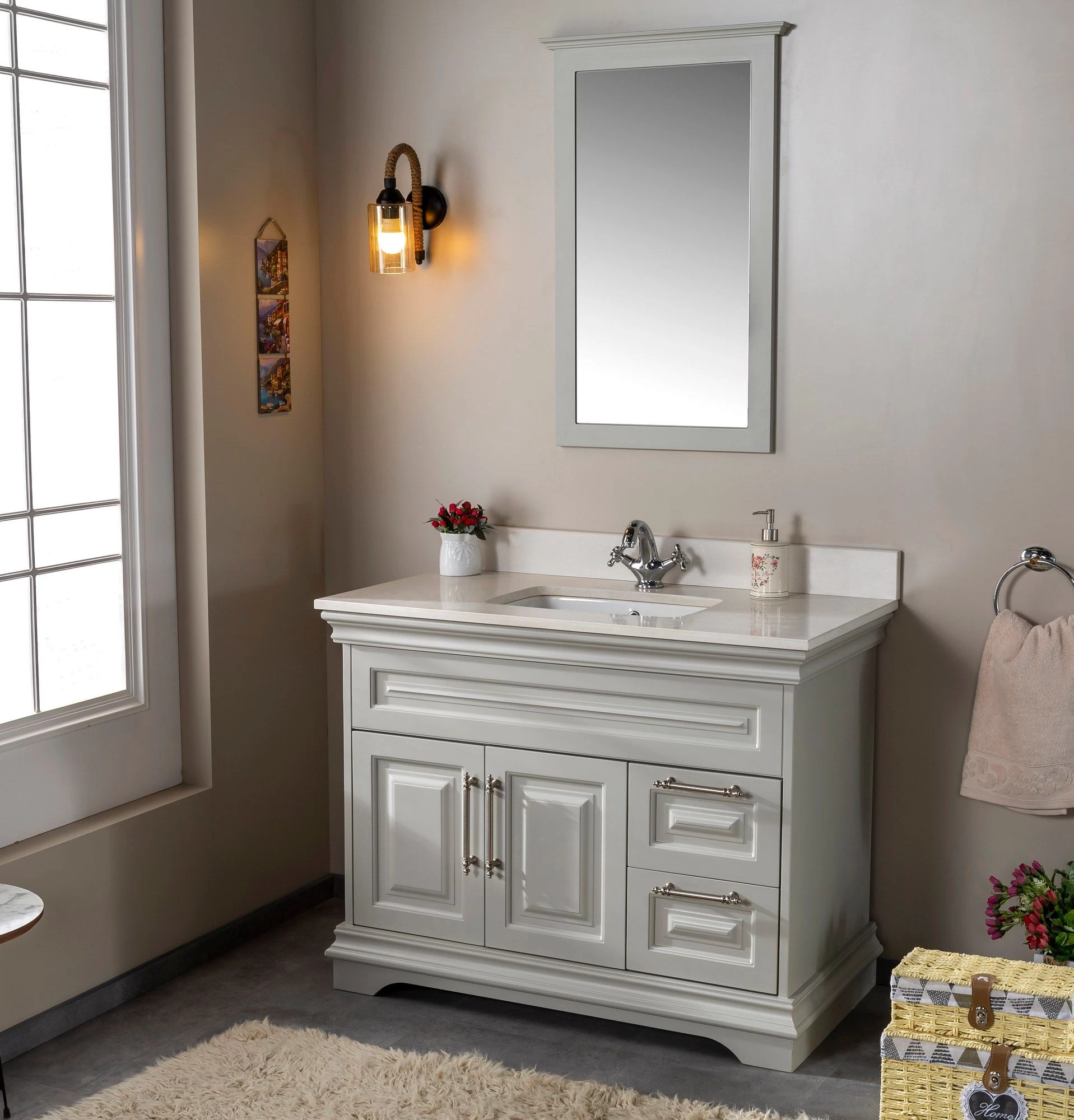Voici l’ensemble de meubles de salle de bain Jussara – un ajout étonnant à toute salle de bain qui allie style, fonctionnalité et durabilité. Fabriqué en MDF 100% LAQUERED (BOIS SOLIDE) avec une épaisseur de 18 mm, cet ensemble de meubles est conçu pour durer.L’une des principales caractéristiques de cet ensemble est le comptoir, qui est fait de 0 WHITE QUARTZ. Non seulement ce matériau est beau et élégant, mais il est également très résistant aux taches, aux rayures et à la chaleur. Associé à l’évier en porcelaine sous plan, cette combinaison crée un aspect élégant et homogène qui rehaussera l’esthétique générale de votre salle de bains.Une autre caractéristique remarquable est le tiroir, qui est construit en 100% BOIS MARIN d’une épaisseur de 12 mm. Ce bois est connu pour sa résistance et sa durabilité exceptionnelles, ce qui en fait le choix idéal pour une salle de bains. Grâce à un vaste espace de rangement, vous pouvez facilement organiser les éléments essentiels de votre salle de bains et garder votre espace libre de tout encombrement.Cet ensemble comprend un miroir flottant, qui ajoute une touche de sophistication et de fonctionnalité. Avec une largeur de 55 cm et une hauteur de 80 cm, ce miroir est la taille idéale pour toute salle de bains. Le design élégant et moderne du miroir complètera l’ensemble de l’ensemble de meubles, améliorant l’ambiance générale de votre espace.Pour compléter l’aspect élégant de cet ensemble de meubles, des poignées en bronze ont été ajoutées aux tiroirs. Avec une largeur de 105 cm, une hauteur de 22 cm et une profondeur de 56 cm, cet ensemble de meubles est conçu pour s’intégrer parfaitement dans la plupart des salles de bains, quelle que soit leur taille. Que votre salle de bains soit compacte ou spacieuse, l’ensemble Jussara ajoutera une touche d’élégance et de fonctionnalité sans encombrer l’espace.En termes de couleur, cet ensemble se décline dans un magnifique ton gris. Cette couleur neutre offre une grande polyvalence et permet de l’assortir facilement à différents décors de salle de bains et à différentes combinaisons de couleurs. Que vous ayez un style traditionnel ou contemporain, la couleur grise de l’ensemble Jussara s’intégrera sans effort et améliorera l’attrait visuel global de votre salle de bain.En résumé, l’ensemble de meubles de salle de bain Jussara offre une combinaison de style, de fonctionnalité et de durabilité. De la construction en MDF 100% LAQUERED au comptoir en quartz blanc, au tiroir en bois marin, au miroir flotal et aux poignées en bronze, chaque détail de cet ensemble a été soigneusement conçu pour rehausser l’expérience de votre salle de bain. Avec