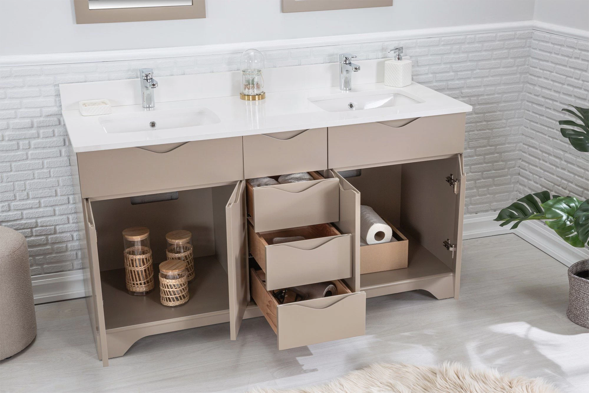 L’ensemble de meubles de salle de bain Jussara est un magnifique ensemble de trois pièces fabriqué avec des matériaux de la plus haute qualité et conçu pour améliorer la fonctionnalité et le style de votre salle de bain. Fabriqué en 100% MDF laqué (bois massif) avec une épaisseur de 18mm, cet ensemble de meubles est non seulement durable mais dégage également une sensation de luxe.L’une des caractéristiques remarquables de l’ensemble de meubles de salle de bain Jussara est son comptoir, qui est fabriqué en 100% Quartz blanc. Ce matériau ajoute non seulement une touche d’élégance à votre salle de bains, mais il est également très durable et résistant aux taches et aux rayures. Associé à un lavabo en porcelaine, ce plan de travail offre un aspect moderne et homogène.Une autre caractéristique clé de l’ensemble de meubles de salle de bains Jussara est son tiroir, qui est construit avec 100% de bois marin et a une épaisseur de 12 mm. Cela garantit que l’ensemble de meubles n’est pas seulement esthétique, mais qu’il est également conçu pour durer. Le bois marin utilisé dans le tiroir offre une résistance exceptionnelle à l’humidité, ce qui en fait un choix idéal pour un environnement de salle de bains.L’ensemble de meubles de salle de bains Jussara comprend un magnifique miroir flotté. Avec une largeur de 55 cm et une hauteur de 80 cm, ce miroir complète parfaitement le meuble de salle de bain, ajoutant de la profondeur et une touche de sophistication à votre espace de salle de bain. Le miroir est fini dans une couleur Cappuccino riche et intemporelle, ajoutant de la chaleur et de l’élégance à n’importe quel décor.Le meuble-lavabo Jussara lui-même possède des dimensions impressionnantes, avec une largeur de 150cm, une hauteur de 22cm, et une profondeur de 56cm. Ces dimensions généreuses offrent un vaste espace de rangement pour tous les éléments essentiels de votre salle de bains. Que vous ayez besoin de ranger des serviettes, des articles de toilette ou des produits d’entretien, le meuble de salle de bains Jussara offre une solution pratique et élégante.En plus de son design saisissant et de ses matériaux de haute qualité, l’ensemble de meubles de salle de bains Jussara offre de nombreux avantages. Le MDF 100% laqué utilisé dans sa construction garantit qu’il est résistant au gauchissement et à la fissuration, ce qui en fait un investissement durable. Le comptoir en quartz blanc n’est pas seulement beau, il est aussi facile à nettoyer, ce qui vous permet d’économiser du temps et des efforts dans votre routine quotidienne dans la salle de bains.L’inclusion d’un évier en porcelaine sous le comptoir améliore encore la fonctionnalité de l’ensemble de meubles de salle de bains Jussara. L’inclusion d’un évier en porcelaine sous plan renforce encore la fonctionnalité de l’ensemble de meubles de salle de bains Jussara. Le tiroir en bois 100% marin ajoute non seulement une touche de luxe, mais offre également une protection durable.
