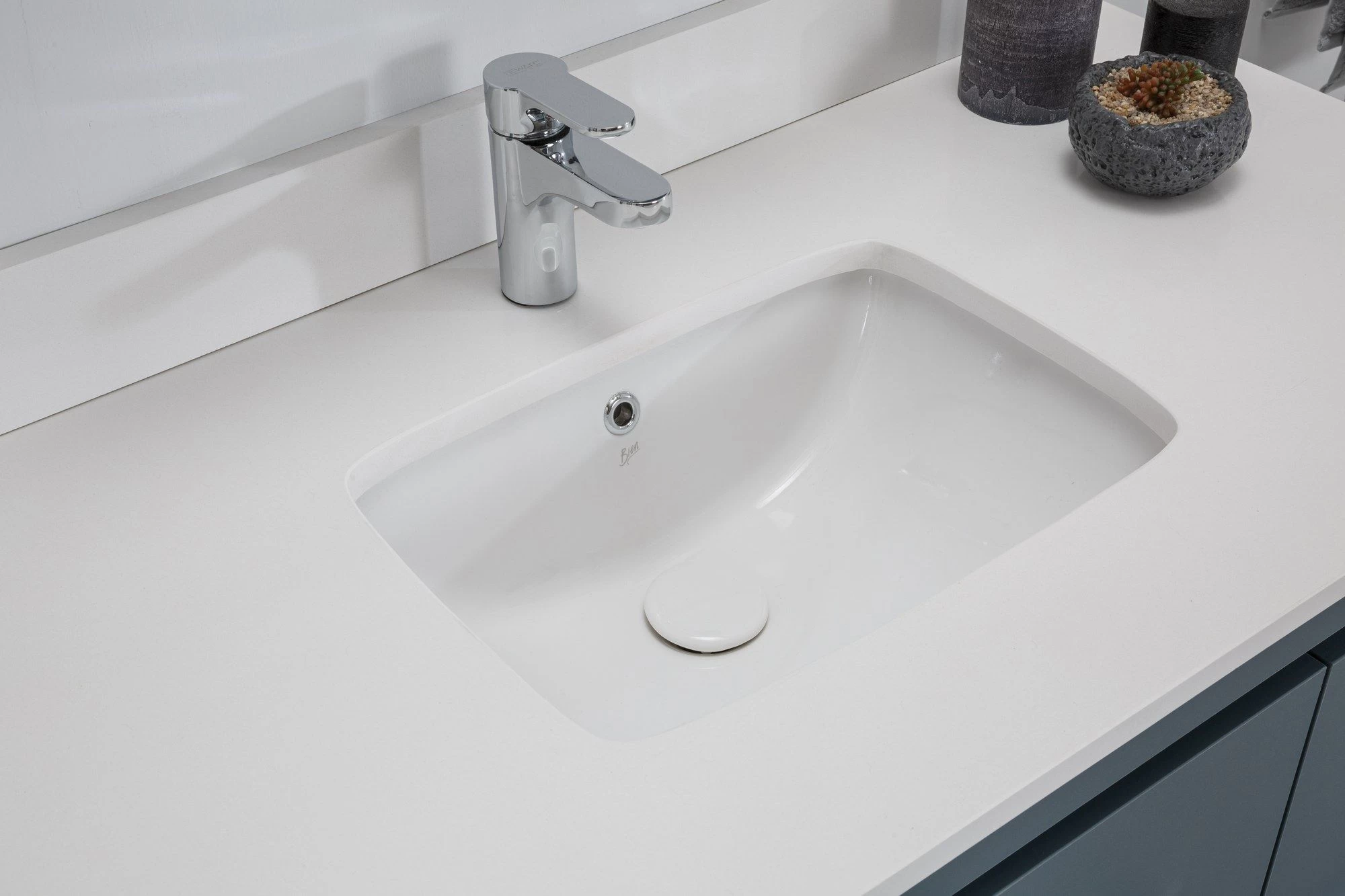 Le comptoir du meuble-lavabo est fait de quartz blanc à 100 %, un matériau luxueux et durable qui résiste aux taches et aux égratignures. Associé à un évier en porcelaine sous plan, ce comptoir ajoute une touche luxueuse à votre salle de bains tout en offrant suffisamment d’espace pour vos besoins quotidiens.