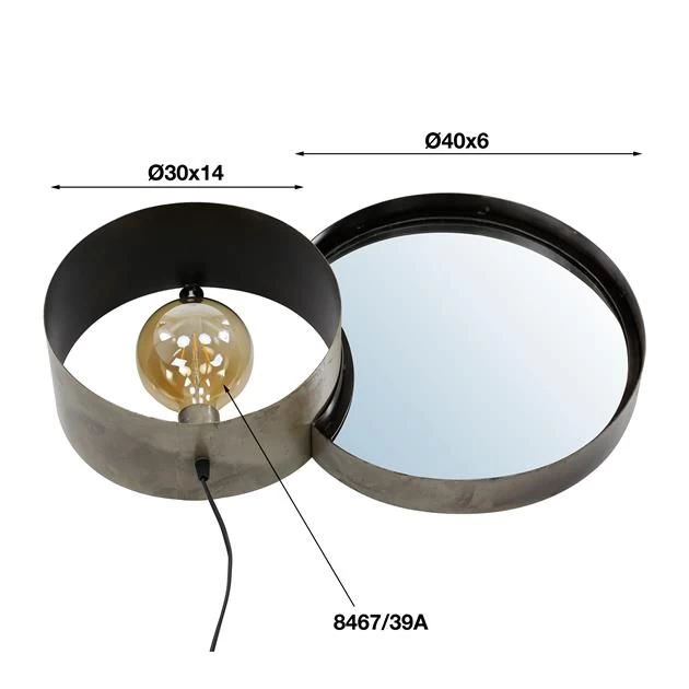 Décorez votre mur de façon originale avec l’applique murale Geri ! L’ensemble lampe et miroir est fabriqué en métal de couleur argent ancien et peut être fixé au mur à l’aide d’un œillet à vis. La lampe a un diamètre de 30,5 cm et le miroir est un peu plus grand avec un diamètre de 40,5 cm. L’ensemble est livré sans source de lumière. Nous recommandons une source lumineuse LED avec un raccord E27 et une puissance maximale de 40W. Vous pouvez allumer la lampe à l’aide d’un bouton situé sur le cordon. Nous vous souhaitons de nombreuses soirées agréables avec l’applique murale Geri !