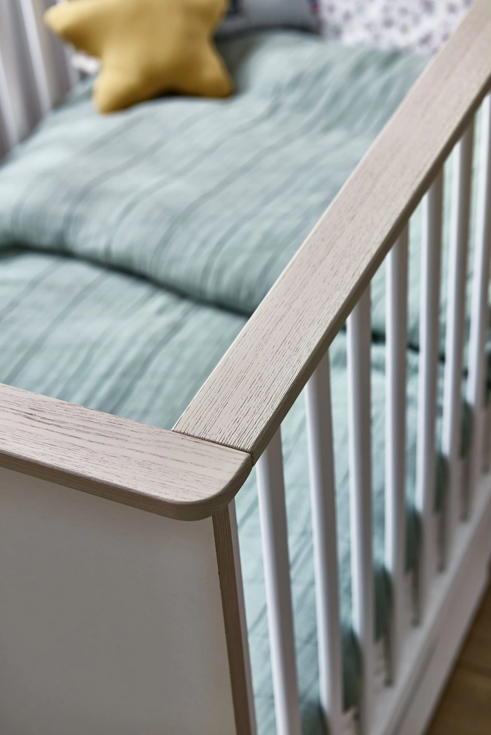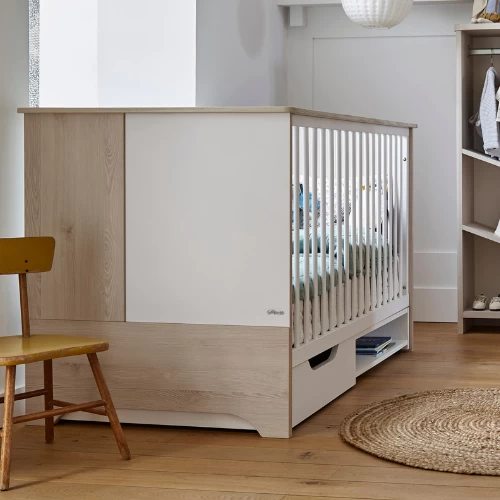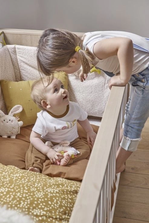 Une chambre d’enfant intemporelle, voilà ce que vous pouvez obtenir avec les meubles de la collection Binno en panneaux de particules. La combinaison du décor de pin blanchi et des surfaces blanches est à la fois élégante et chaleureuse. Bien entendu, la chambre de bébé n’est pas complète sans un lit bébé. Le sommier à lattes de ce lit peut être installé à deux hauteurs différentes. Pour les nouveaux-nés, vous pouvez monter le sommier à lattes en hauteur, puis l’abaisser. Dès l’âge de 3 ans, votre enfant peut entrer et sortir du lit tout seul, et vous pouvez remplacer les barrières de lit par des pans de lit qui sont également disponibles sur notre site. De cette façon, vous transformez le lit de bébé en un lit de jeune enfant. Un matelas de 70 par 140 cm peut être trouvé sur notre site.