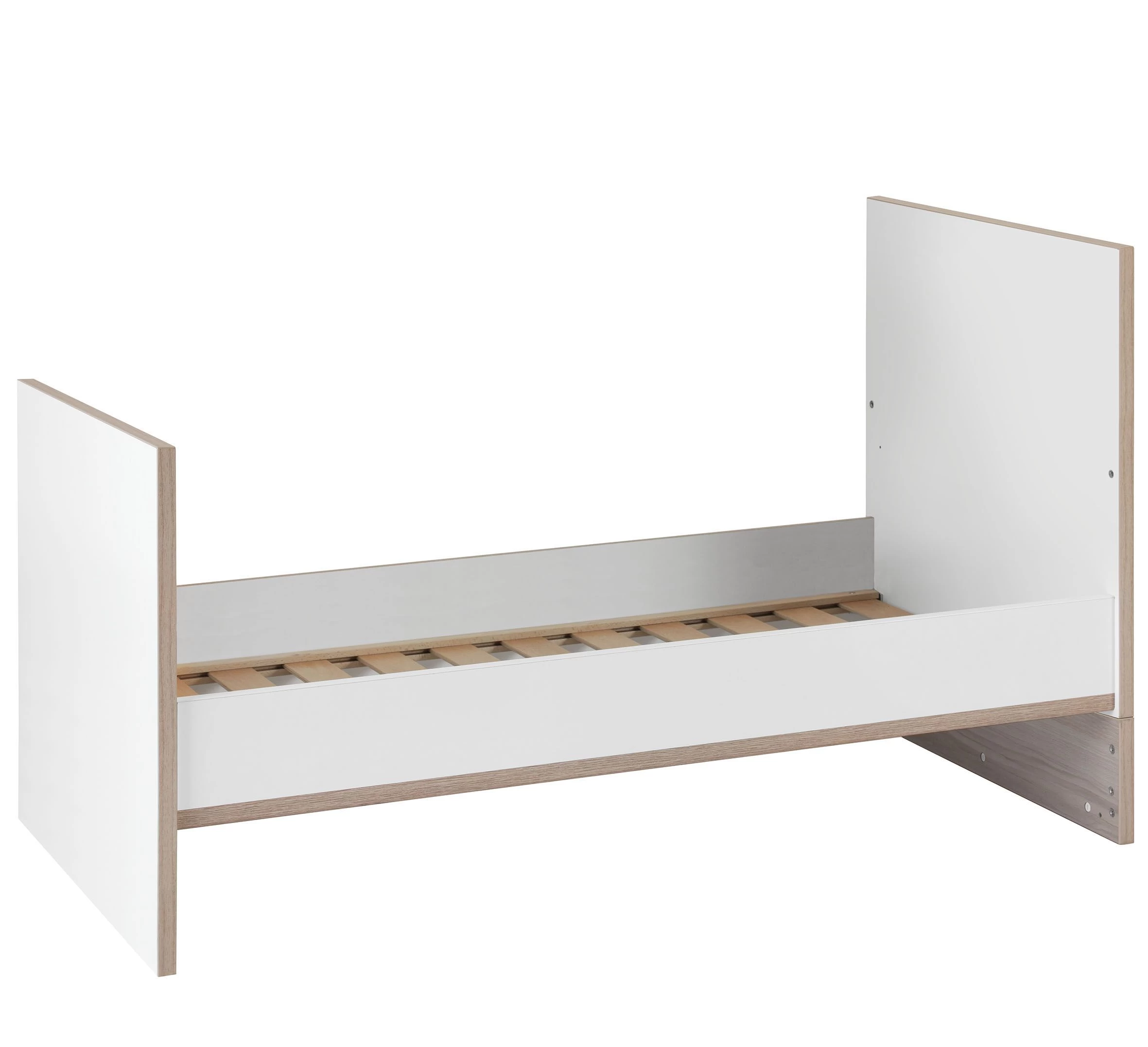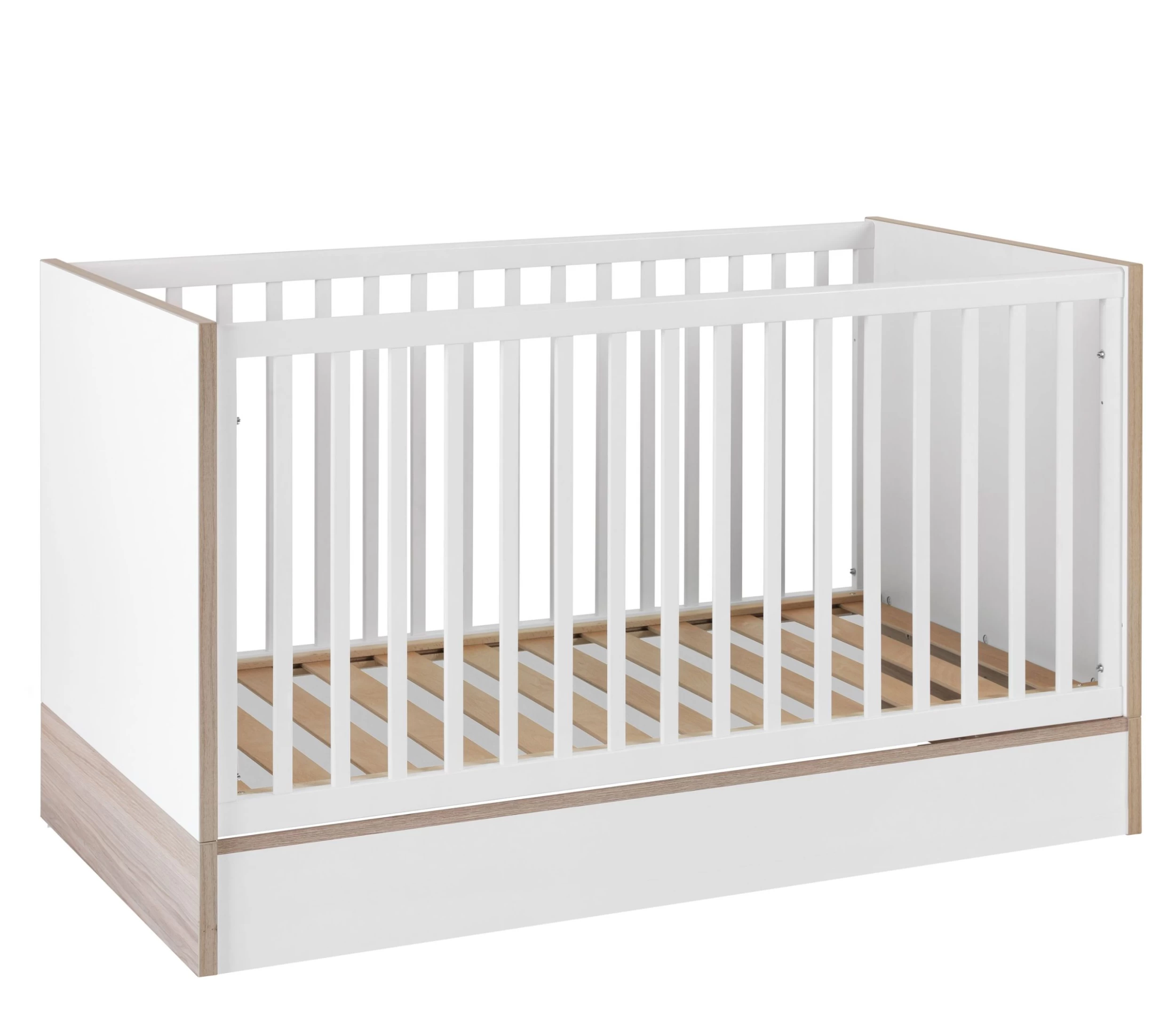 La chambre d’enfant Gabriel respire le calme grâce à ses meubles blancs, fabriqués en panneaux de particules, avec des accents en décor bois. Le lit de la série durera jusqu’à ce que votre enfant ait 5 ans. Vous pouvez installer le sommier à lattes un peu plus bas lorsque votre bébé commence à s’asseoir. Quand votre enfant est suffisamment indépendant, vous pouvez remplacer les barrières par des pans de lit, afin que votre junior puisse entrer et sortir du lit tout seul. Le fond et les bords sont finis en décor de bois de cèdre. Un tiroir de lit n’est pas inclus, mais est également disponible chez nous.