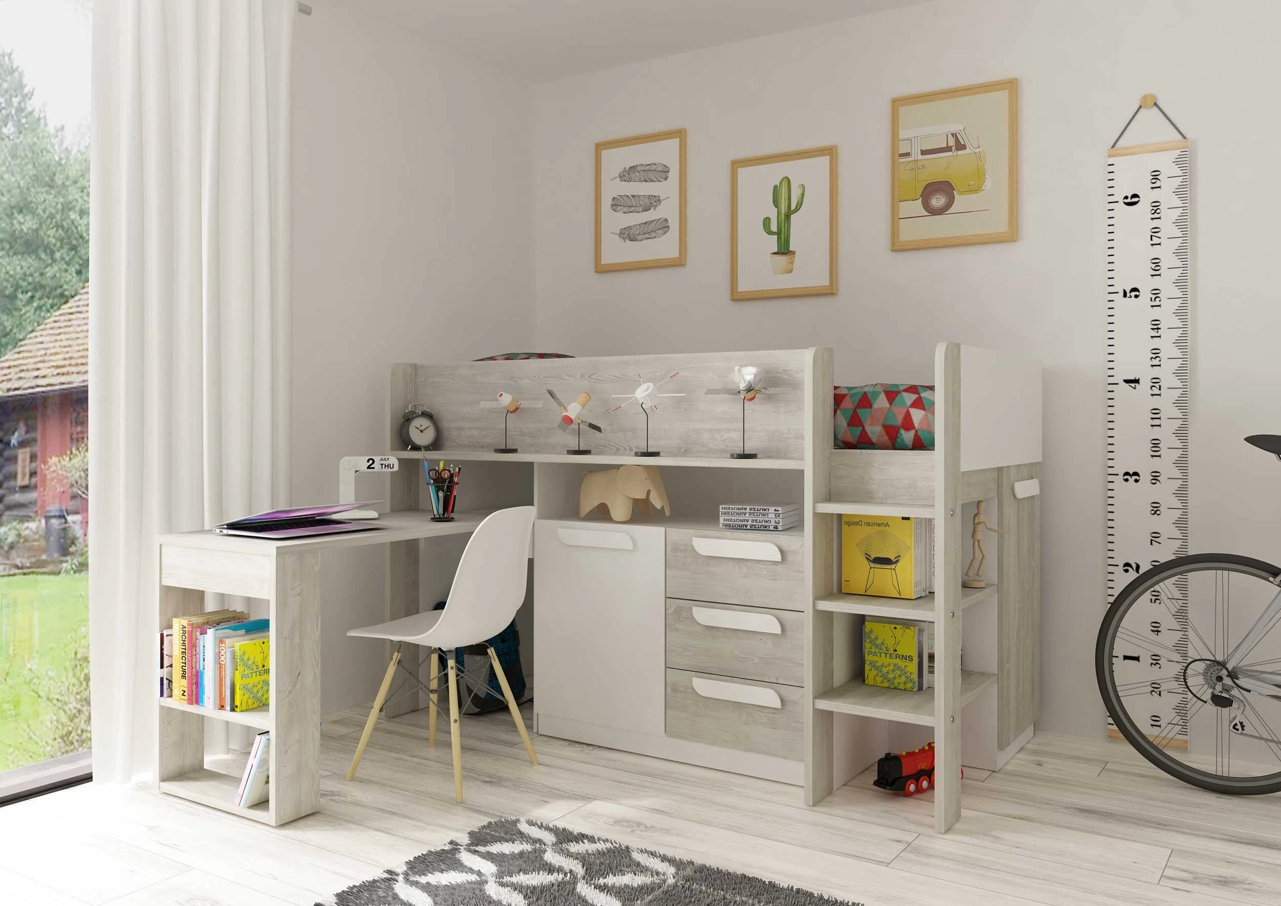 Le lit combiné Beau vous permet d’aménager la chambre enfant avec un seul meuble. Ce lit combiné compte :