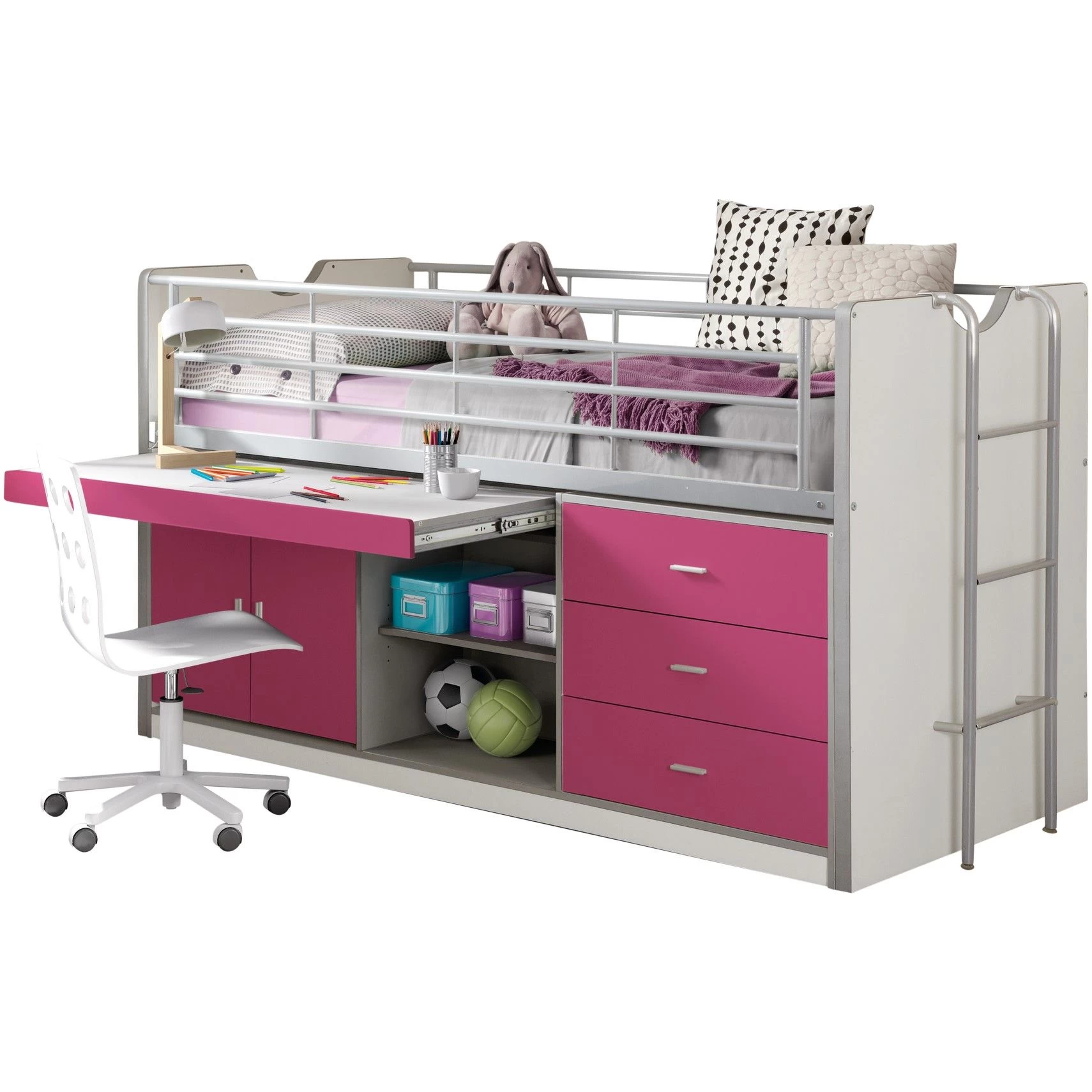 Le lit combiné Bonny au design moderne est disponible en plusieurs couleurs vives. Ce lit est embelli de quelques touches de fuchsia et est également équipé d’un bureau intégré, de 2 niches, de 3 tiroirs et d’une armoire 2 portes. Les dimensions du plateau de bureau : 127×45 cm. Il se trouve à une hauteur de 71 cm. L’espace nuit est facile à accéder grâce à l’échelle qui se situe sur le côté. Vous pouvez la monter tant à gauche qu’à droite. Les bords surélevés garantissent la sécurité de votre petit ange. Ce lit enfant convient aux enfants âgés de 6 ans et plus.