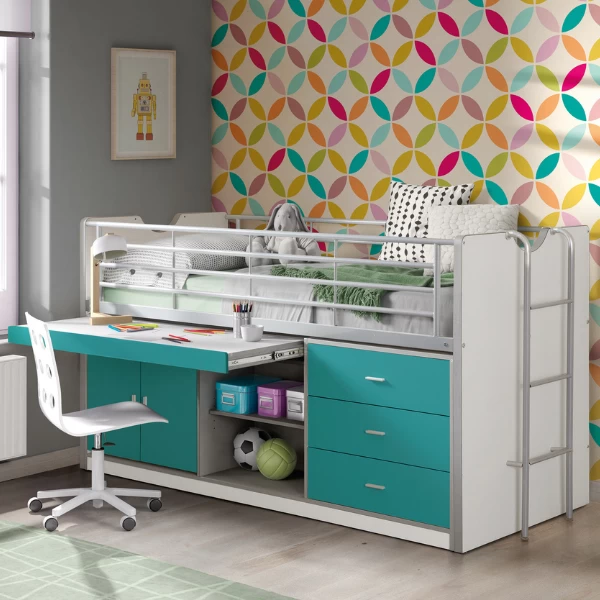 Le lit combiné Bonny au design moderne est disponible en plusieurs couleurs vives. Ce lit est embelli de quelques touches de turquoise et est également équipé d’un bureau intégré, de 2 niches, de 3 tiroirs et d’une armoire 2 portes. Les dimensions du plateau de bureau : 127×45 cm. Il se trouve à une hauteur de 71 cm. L’espace nuit est facile à accéder grâce à l’échelle qui se situe sur le côté. Vous pouvez la monter tant à gauche qu’à droite. Les bords surélevés garantissent la sécurité de votre petit ange. Ce lit enfant convient aux enfants âgés de 6 ans et plus.