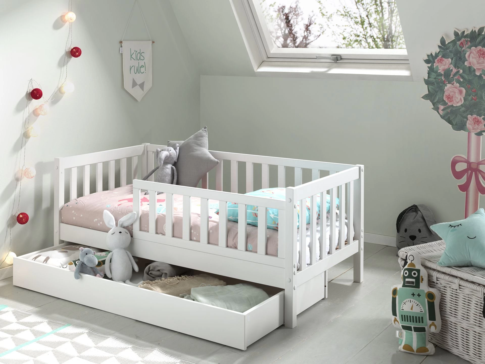 Si votre enfant est devenu trop grand pour son lit de bĂ©bĂ©, mais n’est pas encore prĂŞt pour un “grand” lit, un lit junior est la solution provisoire idĂ©ale. Le lit junior Petronille est fabriquĂ© en bois de pin laquĂ© et dispose d’un sommier Ă lattes fixe. Le lit convient Ă un matelas de 70 x 140 cm. Le matelas n’est pas inclus. Grâce au tiroir de lit pratique, vous pouvez crĂ©er un espace de rangement supplĂ©mentaire pour le linge de lit ou les pyjamas, par exemple. Le design classique et la couleur claire donnent au lit un aspect paisible qui s’adapte Ă tous les intĂ©rieurs. Les cĂ´tĂ©s Ă©levĂ©s font en sorte que votre petit ne puisse pas tomber du lit. Pour que vous et votre enfant puissiez dormir tranquillement.
