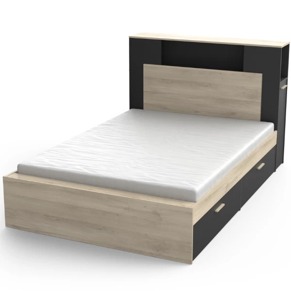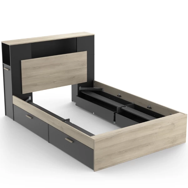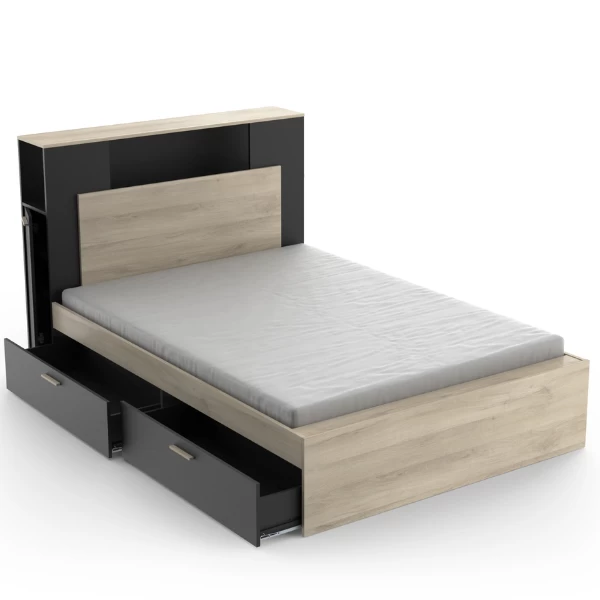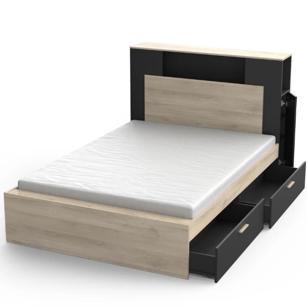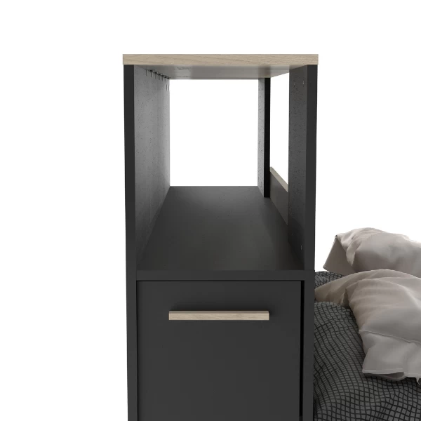 Les accents de bois clairs en décor chêne Kronberg et le noir mat dur font que ce lit s’intégrera parfaitement dans un style d’intérieur industriel. La tête de lit dispose d’une grande niche dans laquelle vous pouvez étaler des livres et des décorations et sur les deux côtés il y a une porte tournante derrière laquelle il y a de l’espace de stockage qui peut être utilisé comme table de chevet. Sur le plateau de la tête de lit on peut encore mettre une lampe de table et un réveil. Sous le lit il y a 4 tiroirs pour stocker de la literie. La longueur de la surface de couchage peut d’ailleurs être adaptée de 190 cm à 200 cm. Combinez dormir et ranger en un avec lit Liva!