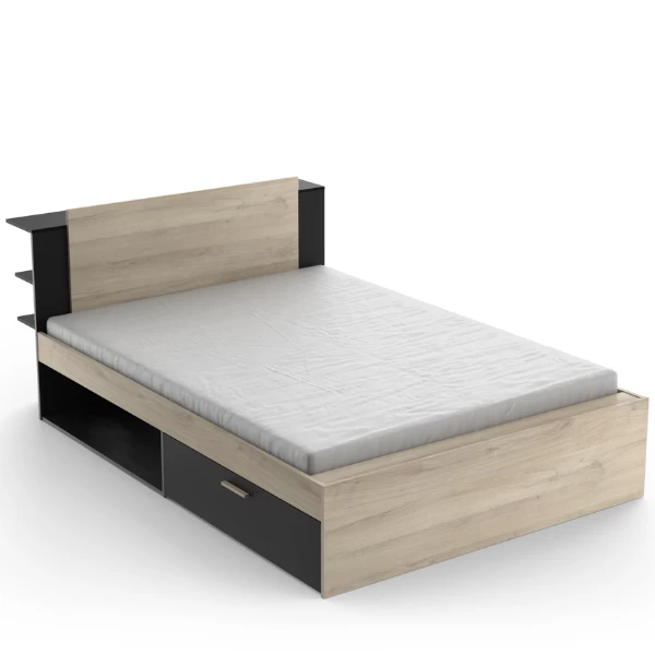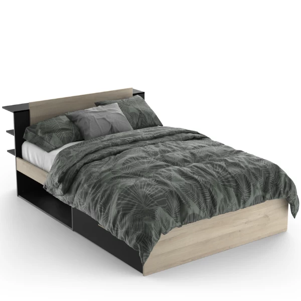 Lit Maura capte l’oeil par la conception élégante de sa tête de lit. La couleur noir mat combinée avec le décor chêne Kronberg donnent au lit un look industriel. Ce lit est non seulement bel à voir mais également très pratique donné que la longueur de la surface de couchage peut être adaptée de 190 cm à 200 cm et qu’il y a plusieurs possibilités de stockage. La tête de lit dispose de 4 niches qui peuvent être utilisées comme tables de chevet. Les 2 niches sous le lit peuvent être utilisées pour stocker des livres et des boîtes à chaussures et dans les 2 tiroirs on peut stocker de la literie. Regardez notre site pour le sommier et le matelas de 140 x 190 cm ou de 140 x 200 cm qui répondent à vos souhaits. Les vis et les chevilles pour le montage mural ne sont pas inclus.