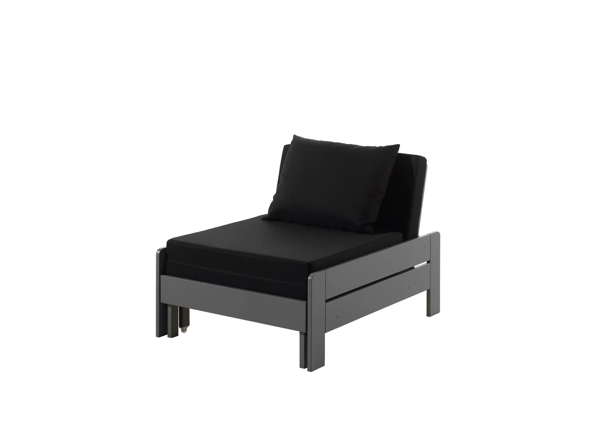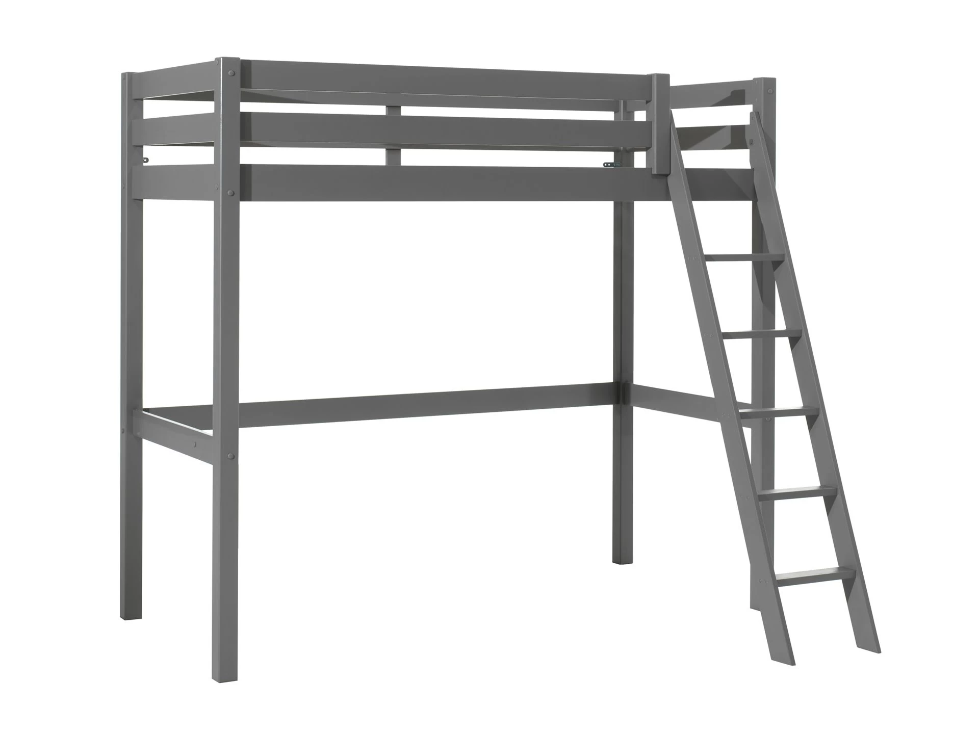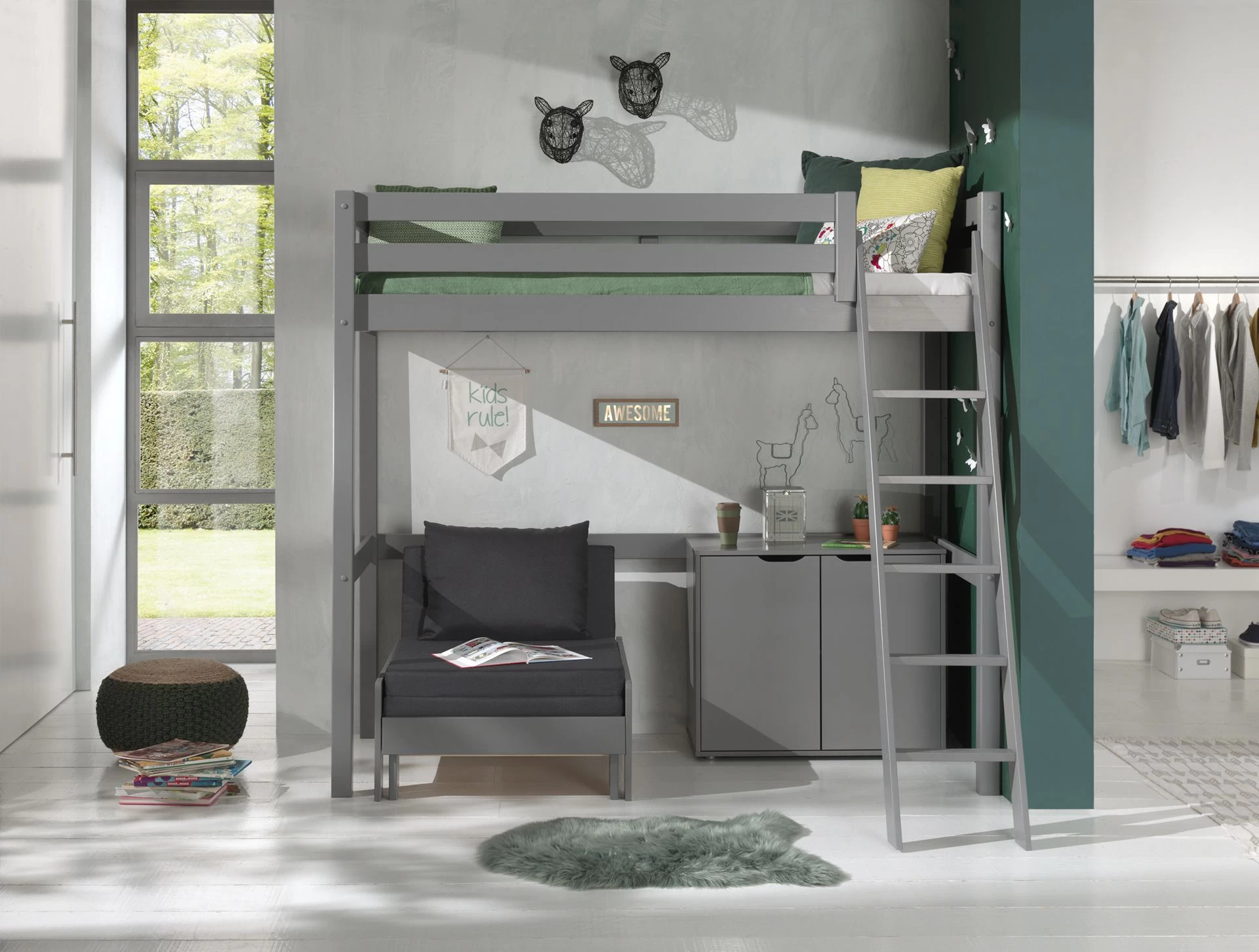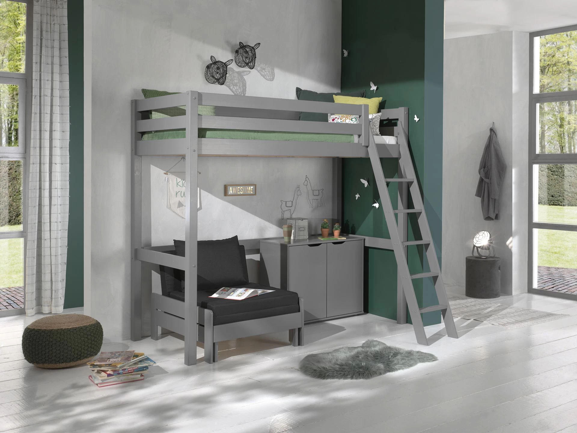 Ce lit mezzanine fait partie de la populaire collection Claire. Le lit est fabriqué en pin massif et est laqué en gris. La laque est à base d’eau et ne contient aucune substance nocive. Cette couchette haute est équipée d’une protection descendante. Vous pouvez accéder en toute sécurité à la zone de couchage grâce à l’échelle pratique. L’espace sous le lit peut être utilisé pour la commode et le canapé-lit. De cette façon, vous créez un coin salon confortable et vous avez rapidement un lit d’invité prêt. La commode offre beaucoup d’espace de rangement pour, par exemple, les livres, les vêtements, etc… Le sommier à lattes est inclus. Le matelas doit être acheté séparément. Nous vous recommandons notre matelas Comfort, 90×200 cm.
