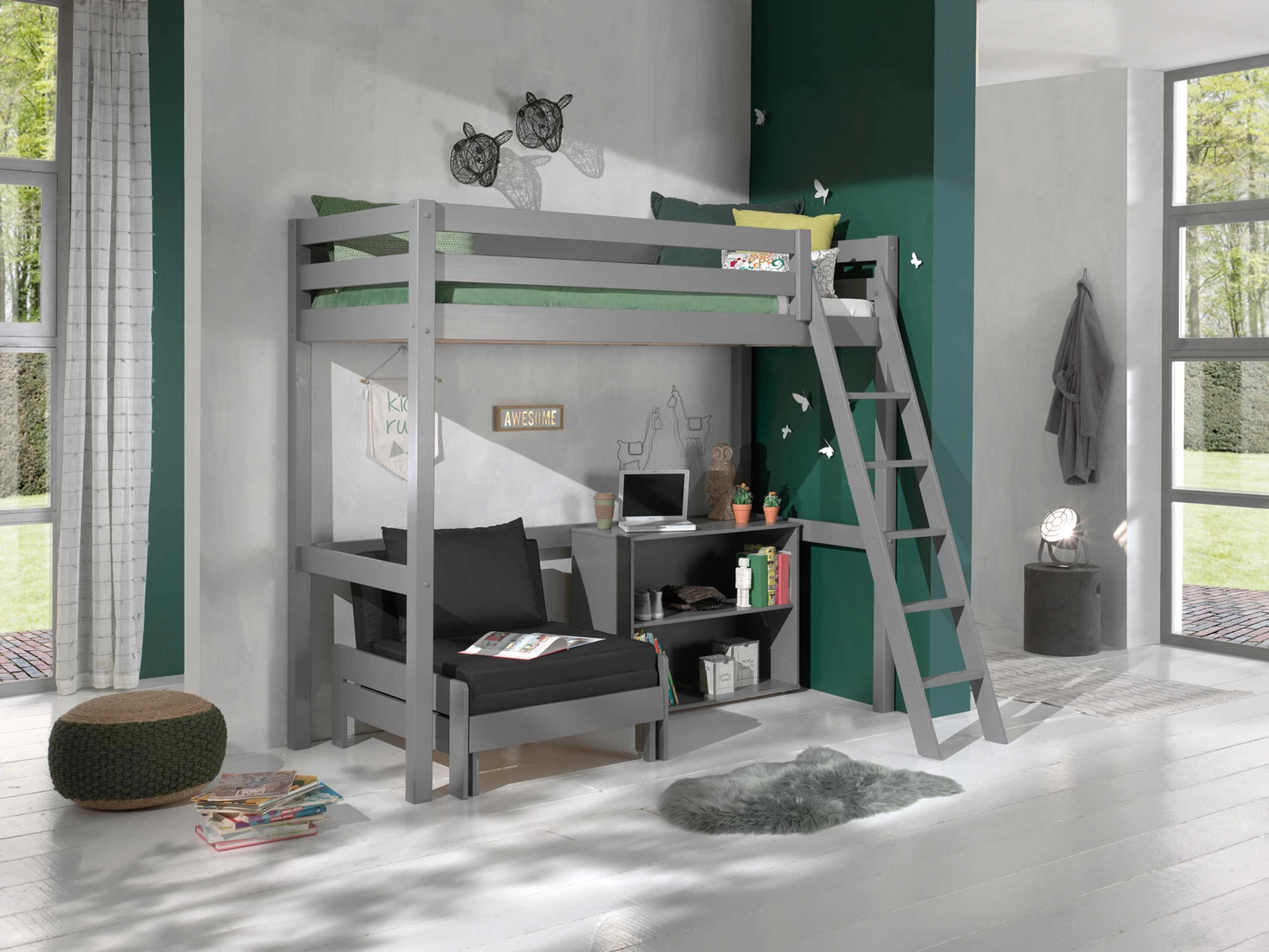 Ce lit mezzanine fait partie de la populaire collection Claire. Le lit est fabriqué en pin massif et est laqué en gris. La laque est à base d’eau et ne contient aucune substance nocive. Cette couchette haute est équipée d’une protection descendante. Vous pouvez accéder en toute sécurité à la zone de couchage grâce à l’échelle pratique. L’espace sous le lit peut être utilisé pour le canapé-lit et la bibliothèque fournis. Ainsi, vous créez un coin de lecture confortable et vous disposez rapidement d’un lit d’appoint. Le sommier à lattes est inclus. Le matelas doit être acheté séparément. Nous vous recommandons notre matelas Comfort, 90×200 cm.