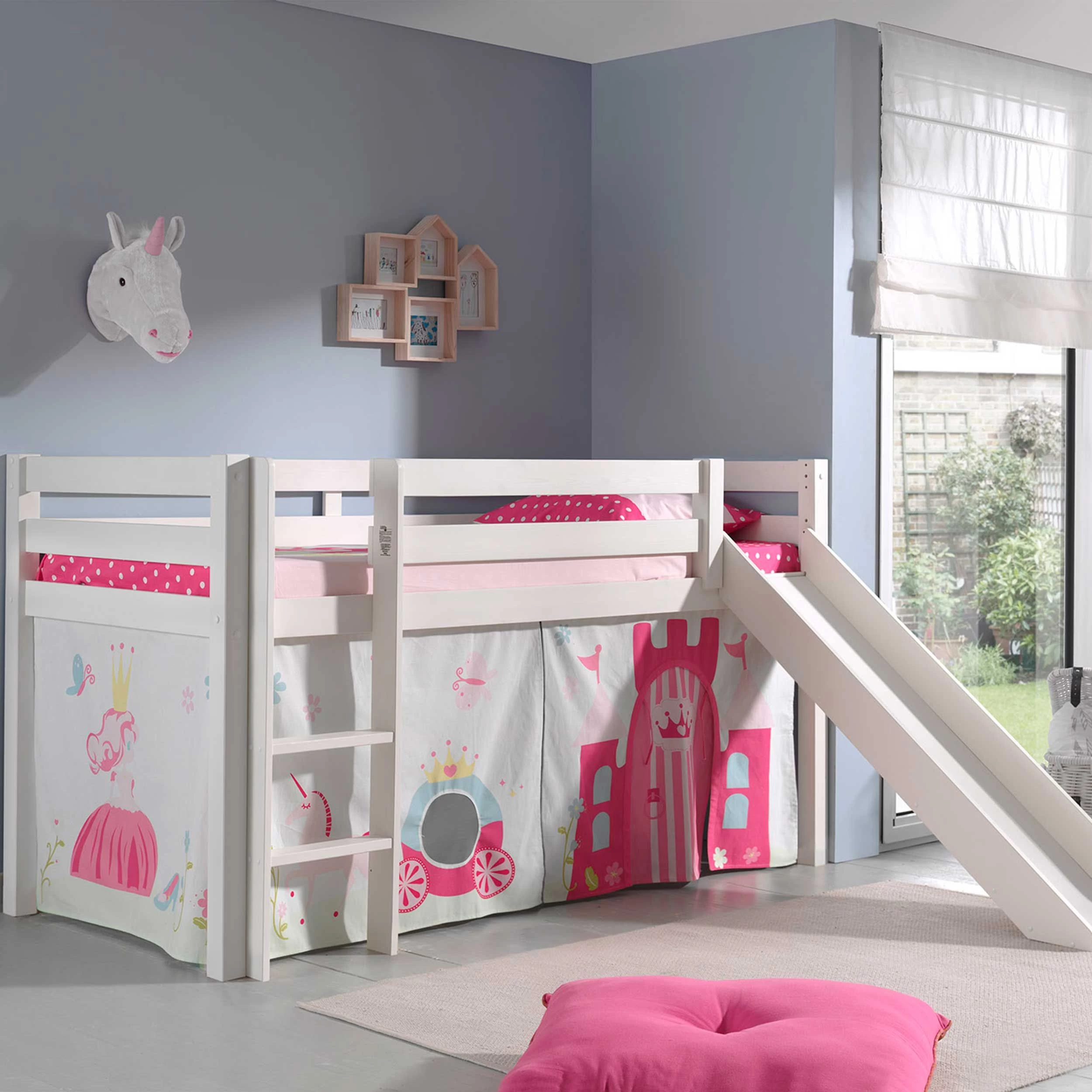 Fabriqué en pin massif laqué blanc, ce lit mi-hauteur Astrid est équipé d’une tente de lit sous le thème de princesses et d’un toboggan. Les pieds de lit ont une épaisseur de 6,5 x 6,5 cm, garantissant la stabilité du lit. Le lit peut se monter dans les deux sens.