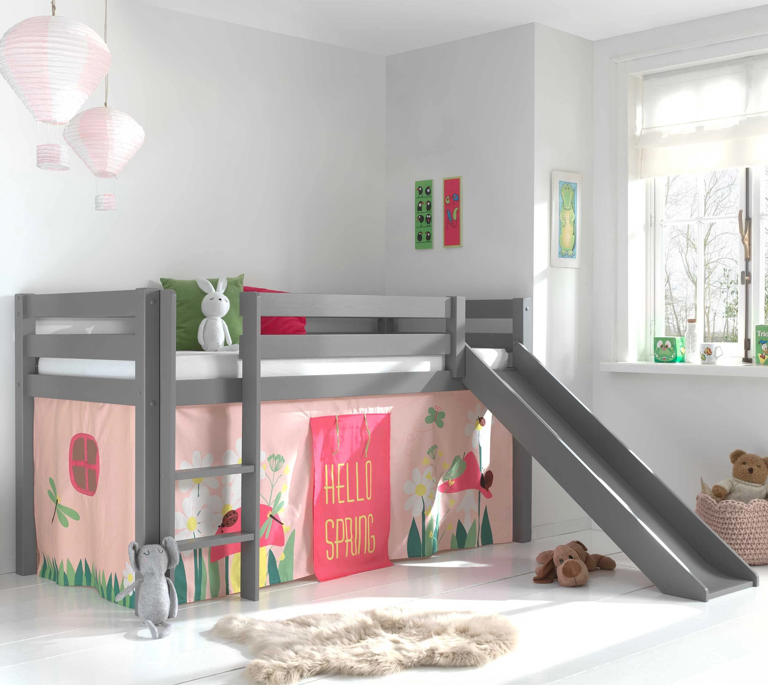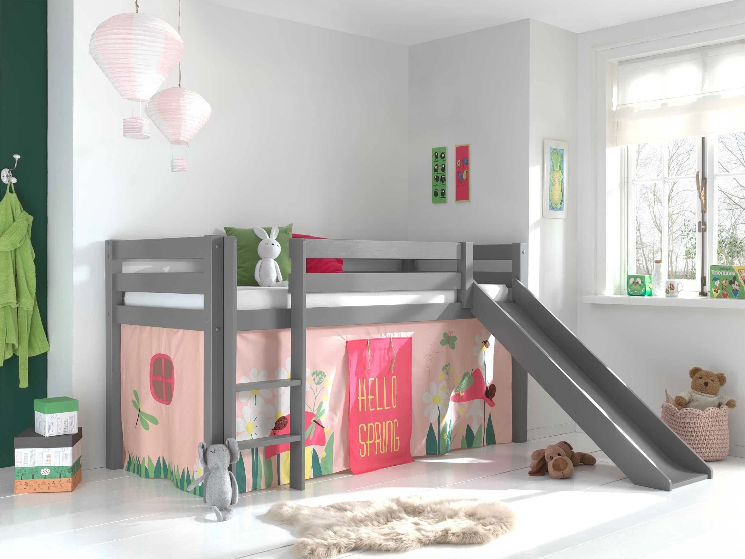 Fabriqué en pin massif, ce lit mi-hauteur Astrid gris est équipé d’une tente de lit sous le thème de printemps et d’un toboggan. Les pieds de lit ont une épaisseur de 6,5 x 6,5 cm, garantissant la stabilité du lit. Le lit peut se monter dans les deux sens.
