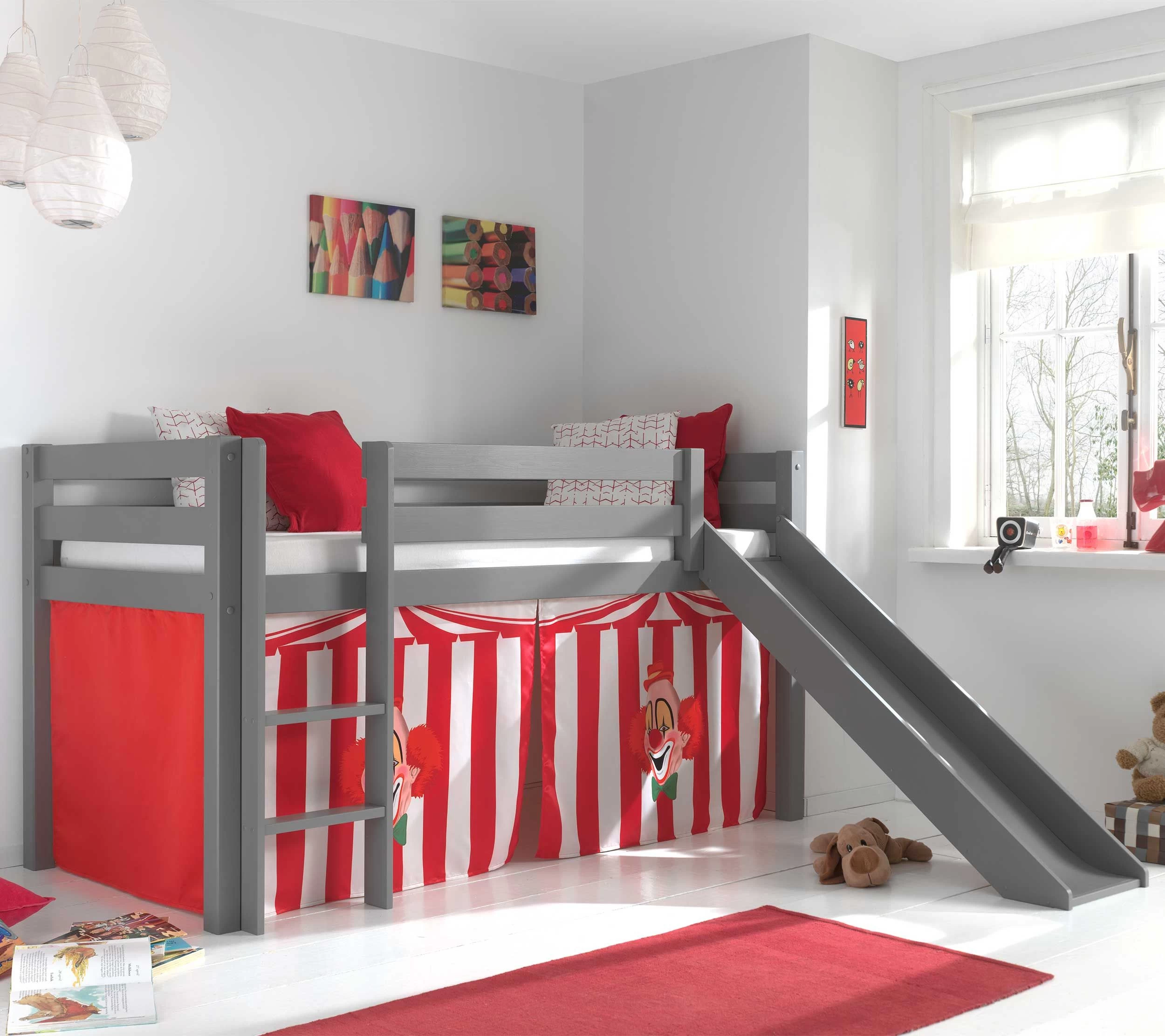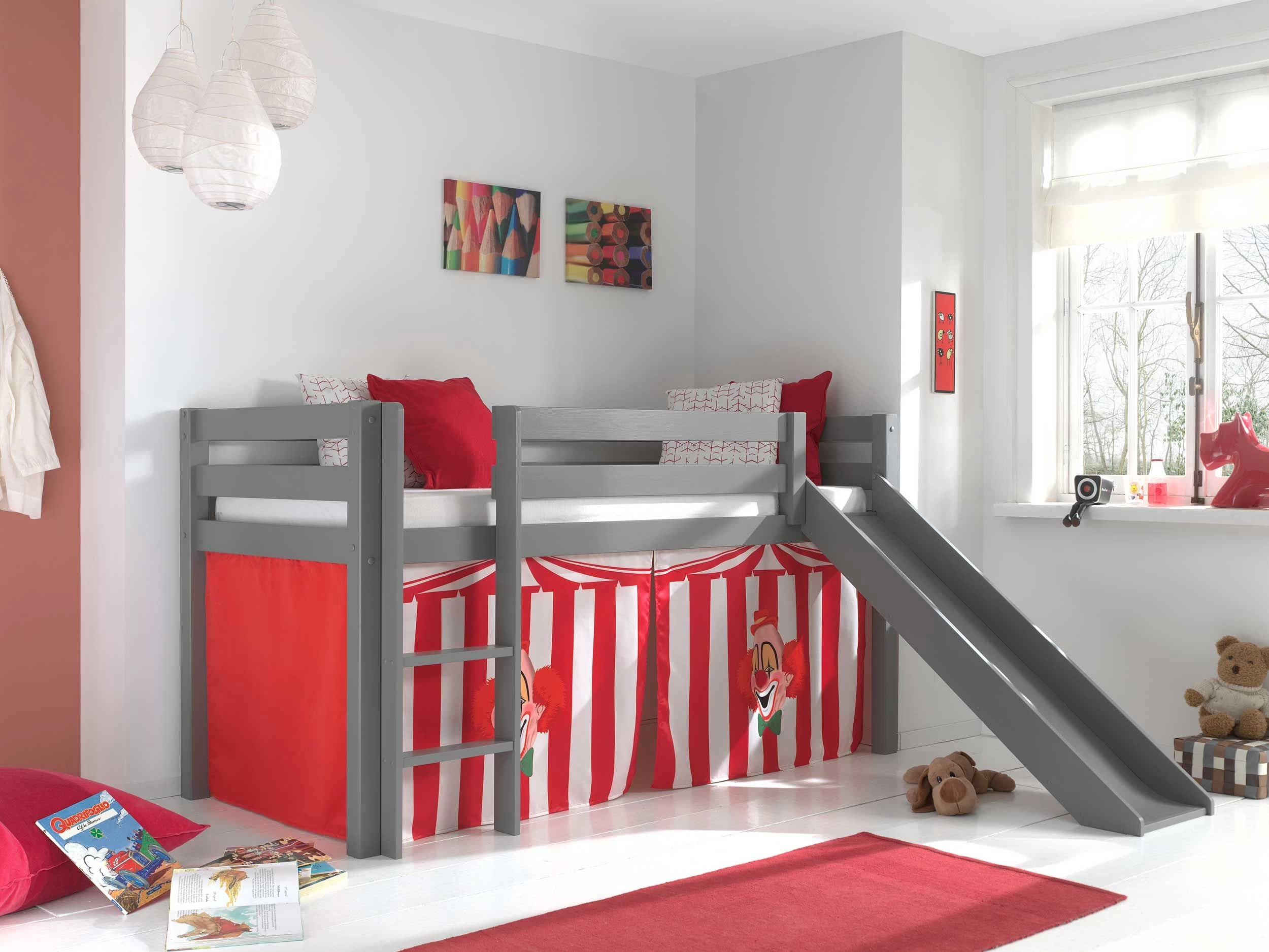 Fabriqué en pin massif gris, ce lit mi-hauteur Astrid est équipé d’un toboggan et d’une tente de lit “cirque”. De quoi shopper ce lit enfant qui convient aux enfants à partir de 6 ans. Les pieds de lit ont une épaisseur de 6,5 x 6,5 cm et les coins sont arrondis, de sorte que ce lit est 100% sûr pour votre adorable artiste de cirque. Le vernis transparent est à base d’eau et ne contient donc pas de substances toxiques. Le lit peut se monter dans les deux sens.